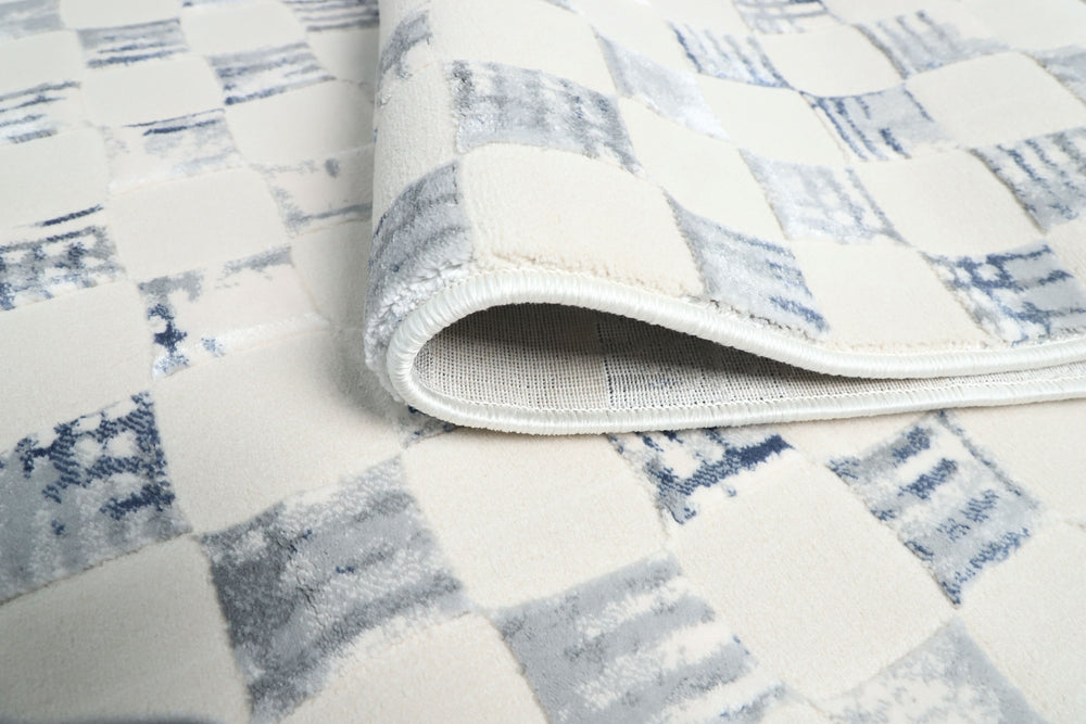 Brooke 751 Cream/Blue features a captivating and modern checkered design with an artisanal, hand-stamped feel. The pattern showcases a series of structured squares in a soft, muted blue, beautifully distressed against a serene cream and ivory background. This layered effect creates a sense of both playful rhythm and sophisticated texture, bringing a fresh, contemporary aesthetic to any space.
