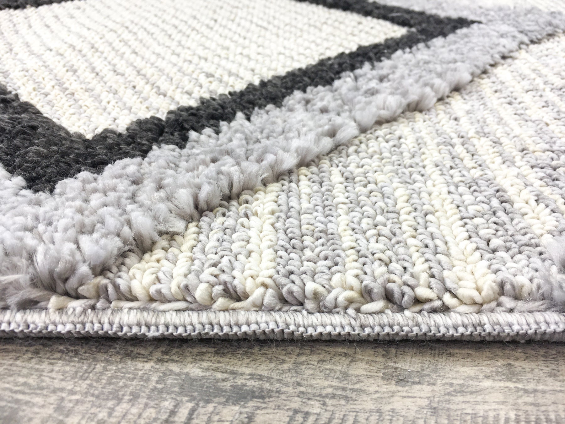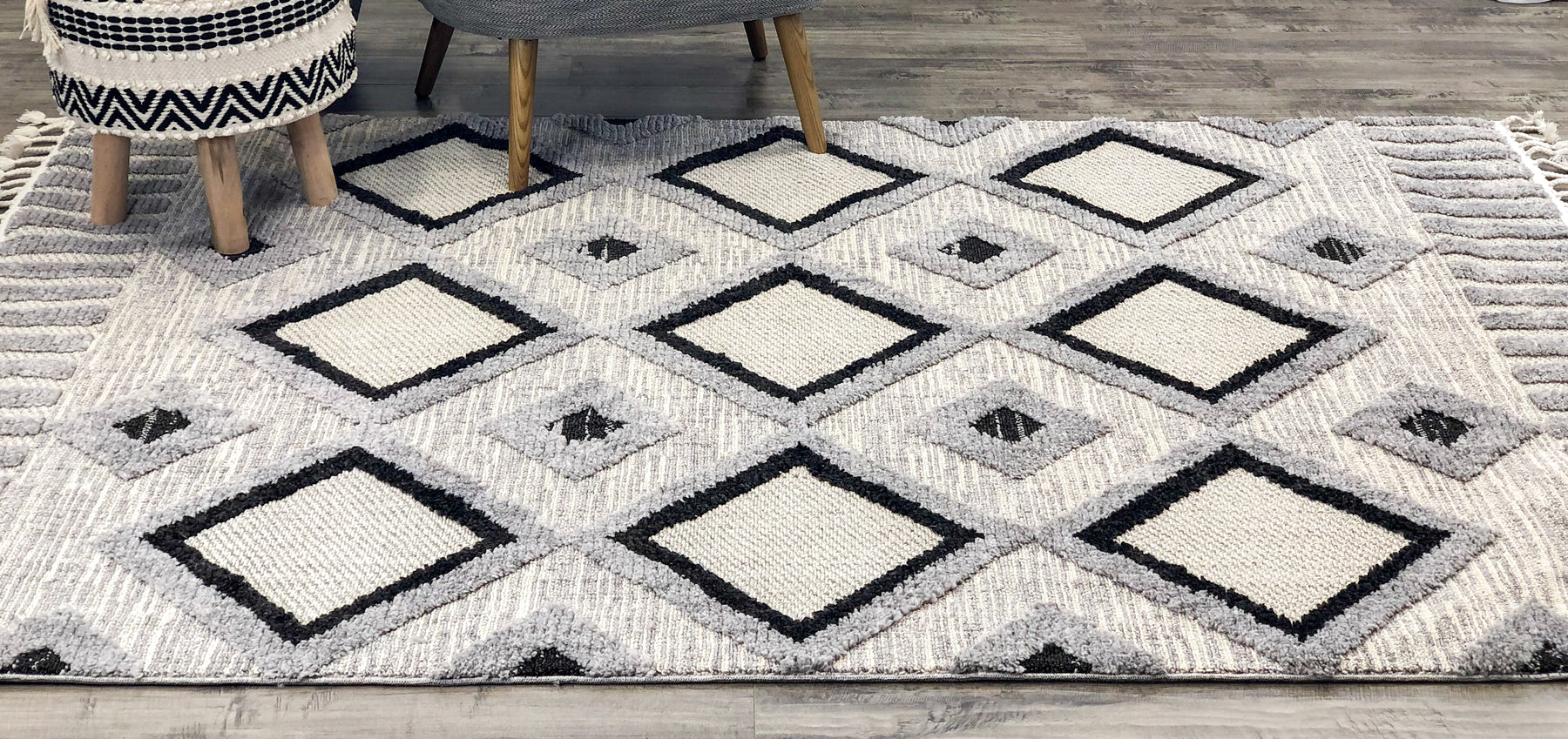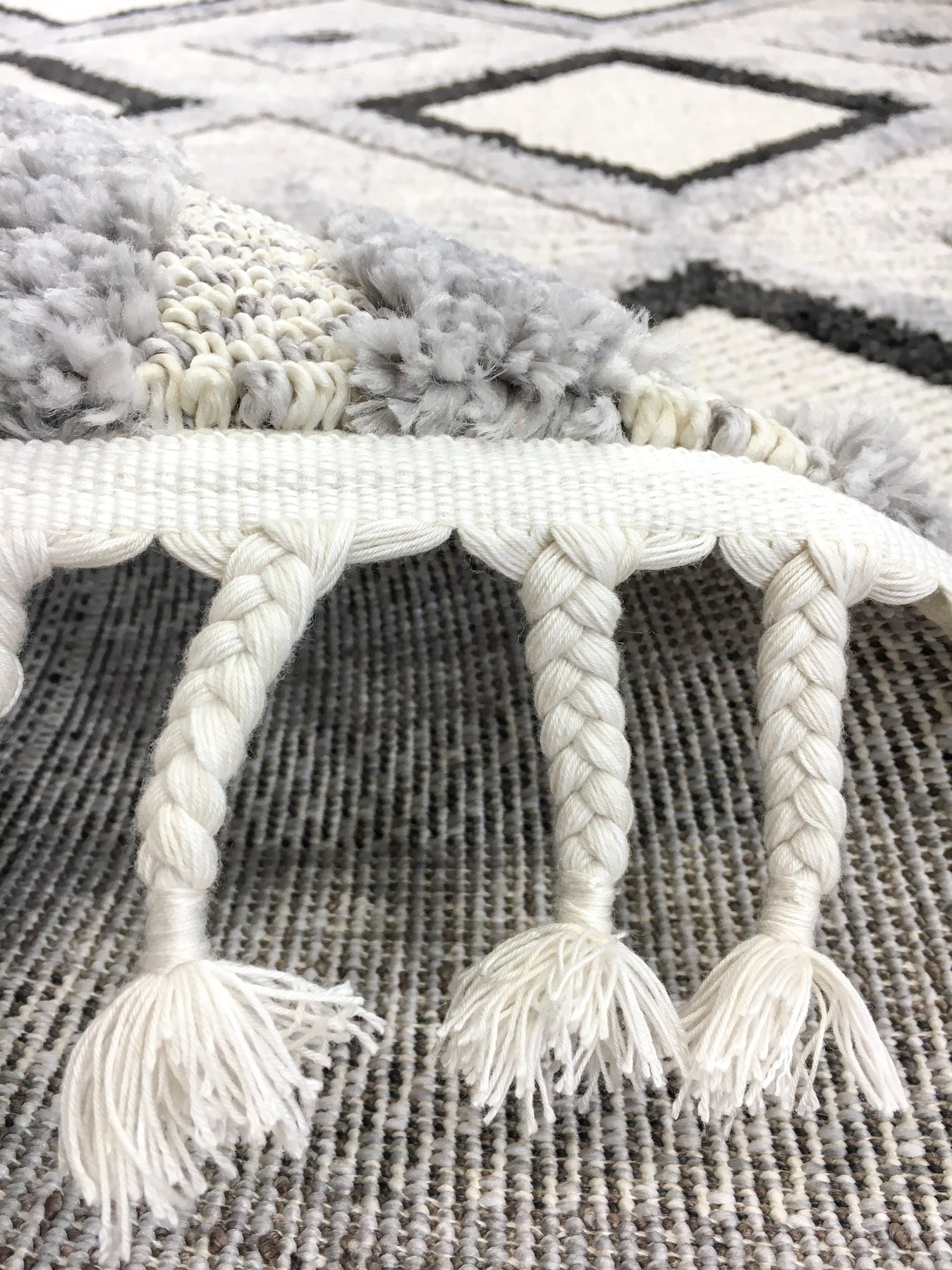 Our Muskoka Collection is the perfect way to bring warmth and texture into your space. The large geometric shapes are beautifully woven slightly taller than the looped base of the rug creating depth and character. The multi-weave finish gives your feet a cushioned comfort. The chunky braided fringe makes a real statement and is surprisingly low maintenance and non-shedding. Colours found in this Muskoka design include Cream, Light Beige, Silvers, Soft Greys, and Black.