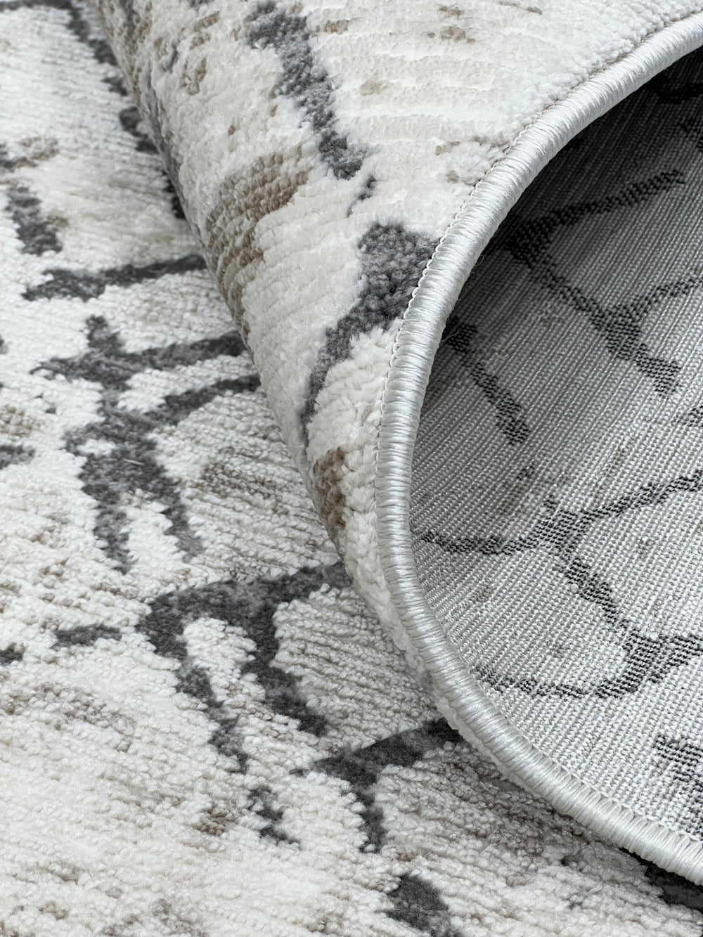 Brooke 672 showcases a sophisticated and modern design with an abstract geometric pattern. The rug features a delicate, intersecting grid of lines that creates a woven, textured feel. Rendered in a harmonious blend of light beige and subtle grey, this intricate line-work is beautifully distressed against a luminous cream and ivory background. The result is an elegant and understated pattern that provides a versatile foundation for any room.