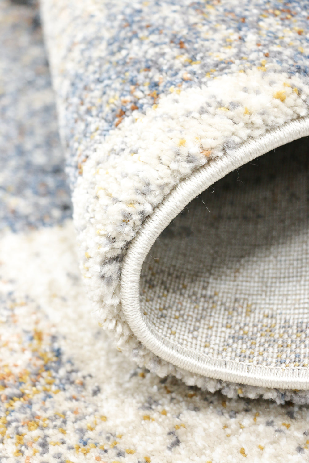 This ultra-soft and plush rug from our Gallery Collection features a stunning abstract art with many neutral tones and punches of subdued blues and oranges. This rug is simple with a statement that will pop in any room.