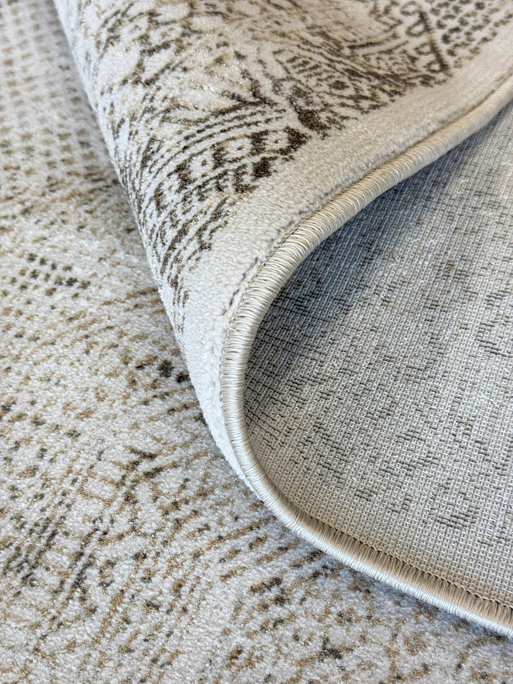 Lagos 07 presents a distressed transitional style with a rich blend of traditional and tribal motifs. The rug's surface is composed of an intricate grid of patterns that have a purposefully faded appearance, culminating in a striking diamond-like center medallion. This captivating design is rendered in a sophisticated palette of taupe, light grey, and beige, with subtle bronze and olive green accents, creating a nuanced and impactful visual statement that anchors any room.