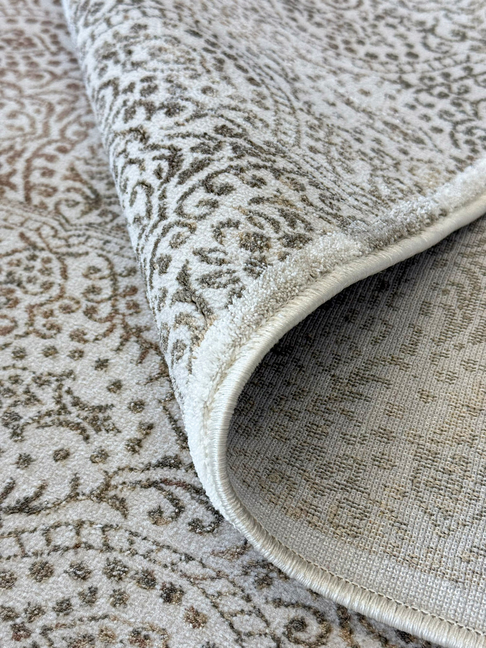 Lagos 46 presents a beautifully distressed traditional design with a classic aesthetic. The rug's surface features an intricate grid of repeating medallions and floral motifs that have a purposefully faded appearance, giving it a timeworn, vintage-inspired character. This complex pattern is rendered in a refined palette of taupe, light grey, and beige, with subtle bronze and olive green accents, creating a nuanced and impactful visual statement that anchors any room.
