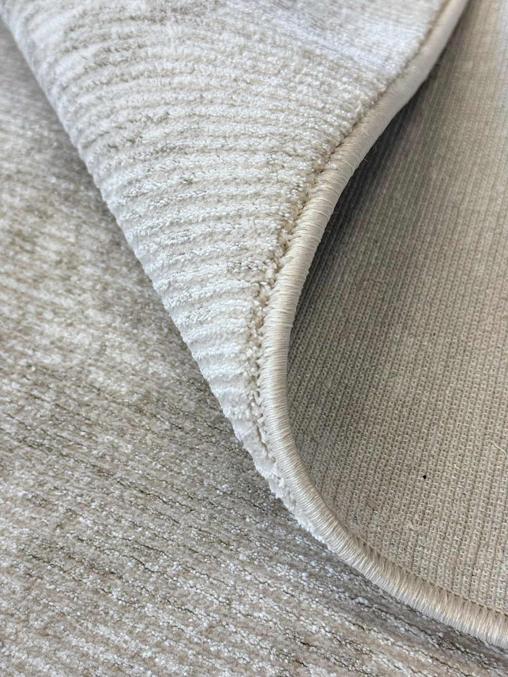 London Fog 98-36 presents a captivating abstract design that evokes a sense of serene, painterly motion. The rug's surface features a textured field of subtle horizontal striping and faded effects, creating a versatile and sophisticated visual. The palette is a tranquil blend of grey tones and creamy off-white, offering a calming and contemporary foundation for any room.