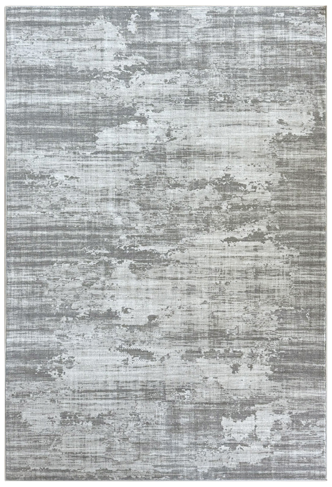 London Fog 99 showcases a beautifully abstract design with a distressed, painterly aesthetic. The rug's surface features soft, horizontal streaks and mottled bands of color, creating a sophisticated and flowing visual. The palette is a tranquil mix of light and dark grey tones, subtly blended with hints of off-white and cream, offering a versatile and modern foundation for any room.