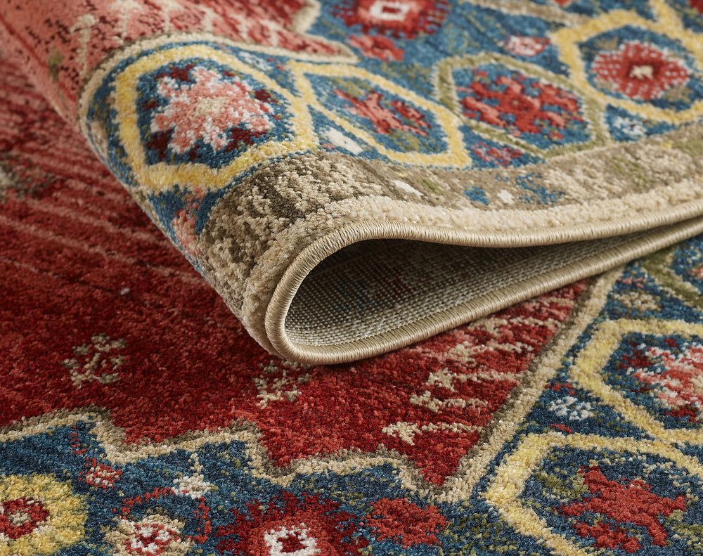 The Avant 37 Red rug offers a captivating take on traditional style with a modern, distressed finish. The design centers on a large, ornate medallion in a unique diamond shape, filled with delicate floral motifs. A series of layered borders frame the central pattern. The rug's rich red backdrop is artfully distressed, allowing its intricate beige, ivory, and blue details to come to life. The rug is finished with delicate fringe, which adds to its sophisticated, handcrafted appeal.