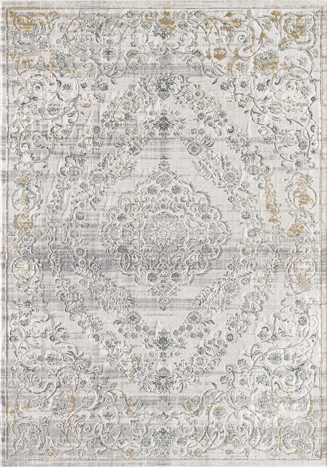 Transitional area rug with taupe, cream, and soft grey damask pattern from the Ginza Collection, Design 30. Low pile with a refined distressed look.