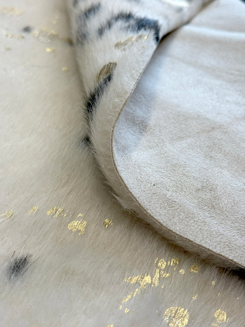 Graceful yet bold, the Collingwood Black Gold rug adds a touch of luxury to any interior. Crafted from plush acrylic, this faux cowhide features an elegant ivory base, adorned with striking black markings and finished with splashes of gold shimmer that reflect the light for a subtle, glamorous glow.
