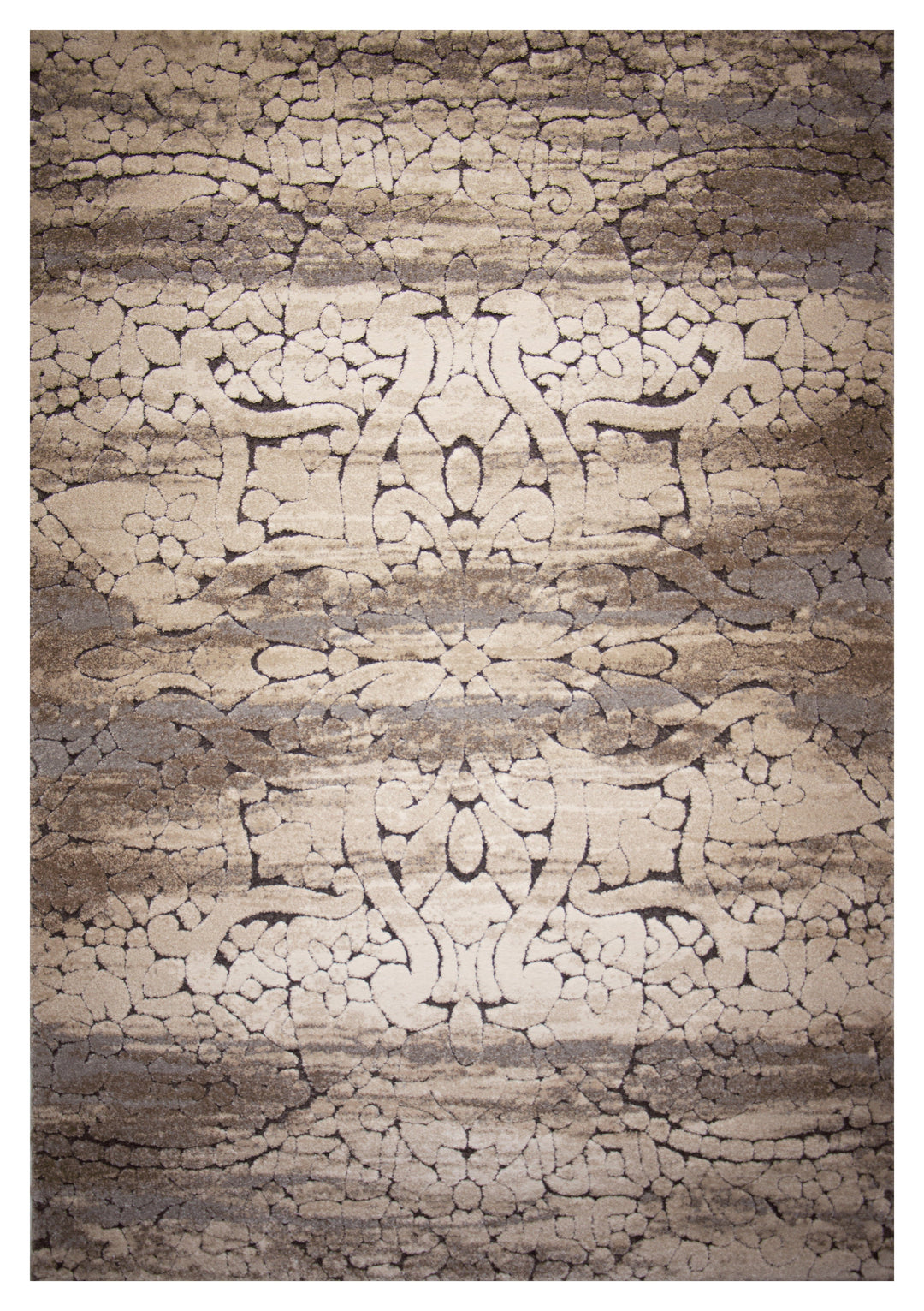 A modern geometric patterned rug with a beige and brown color palette, featuring a textured design and abstract patterns.