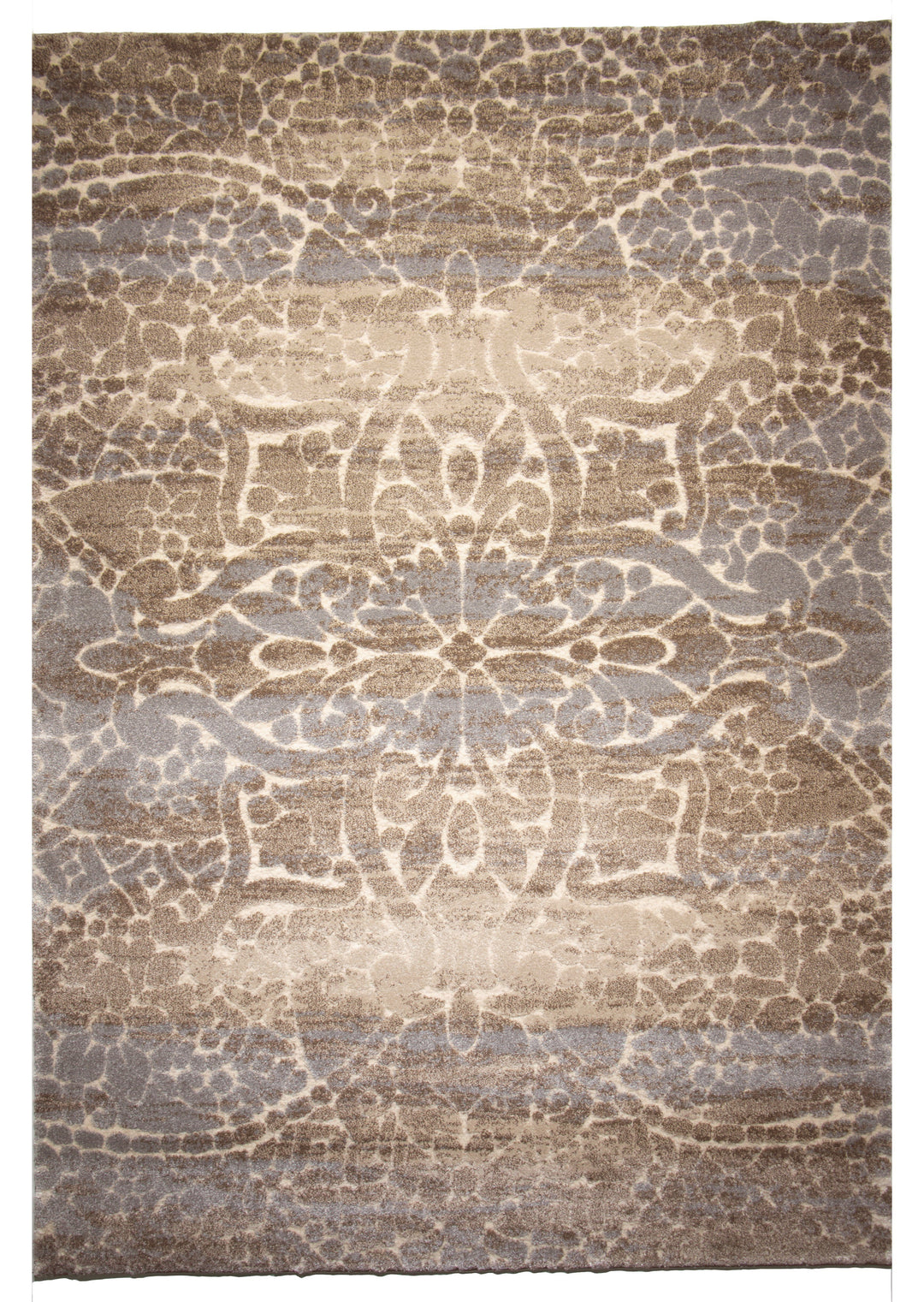 Transitional rug with an ivory base, sky blue, taupe, and charcoal distressed motifs. Flat and dense for easy furniture movement