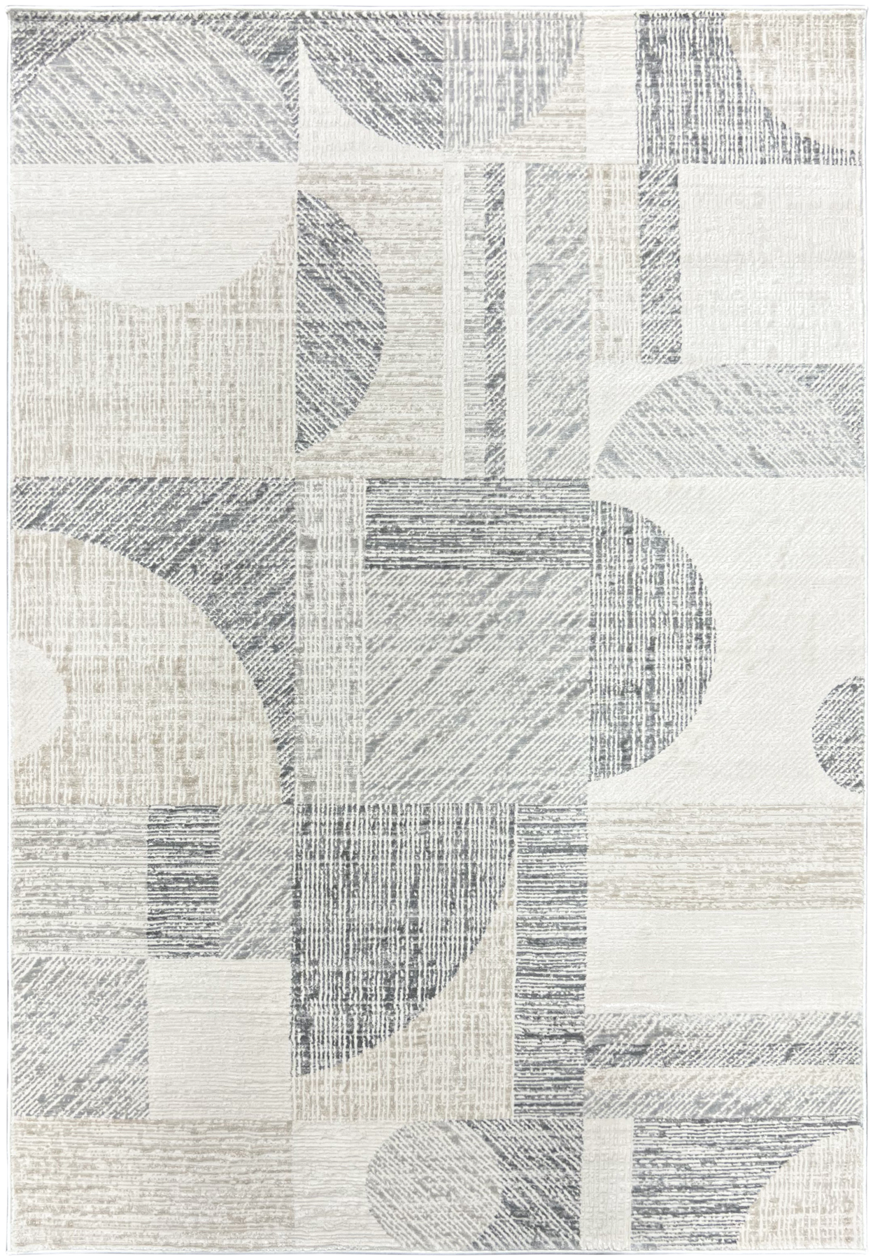 Brooke 673 Cream/Light Beige showcases a captivating modern design with an abstract geometric composition. Artfully arranged shapes, including intersecting rectangles and segments of circles, are rendered in a soft and inviting palette of cream and light beige tones. Each segment features a unique textural detail, adding visual depth and sophisticated allure to this contemporary piece.