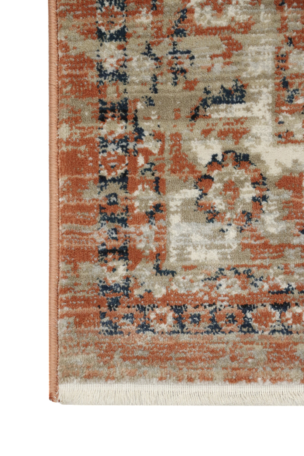 This taupe base transitional rug has a mix of coral peach tones, cream and rich blues. With the distressed pattern predominantly consisting of taupe and coral, this rug will fit both neutral and warm toned spaces. Add a little character and richness to any space.