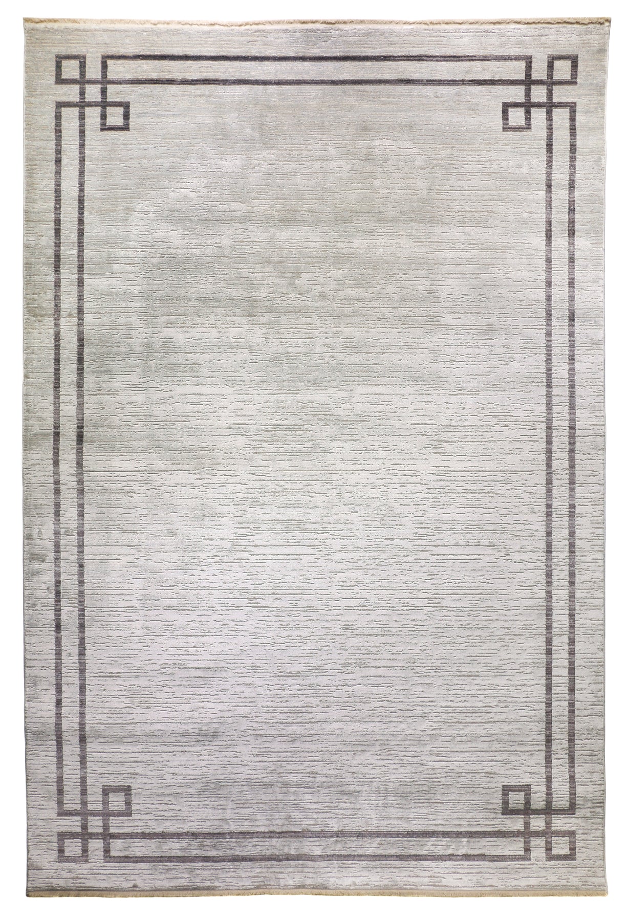 The Azure 539 rug embodies a refined, minimalistic elegance with its beautiful vintage-inspired border. A simple yet sophisticated charcoal border frames a stunning textured background that blends tones of luminous silver and warm beige. The overall design is understated, allowing its subtle beauty and intricate texture to elevate any room.
