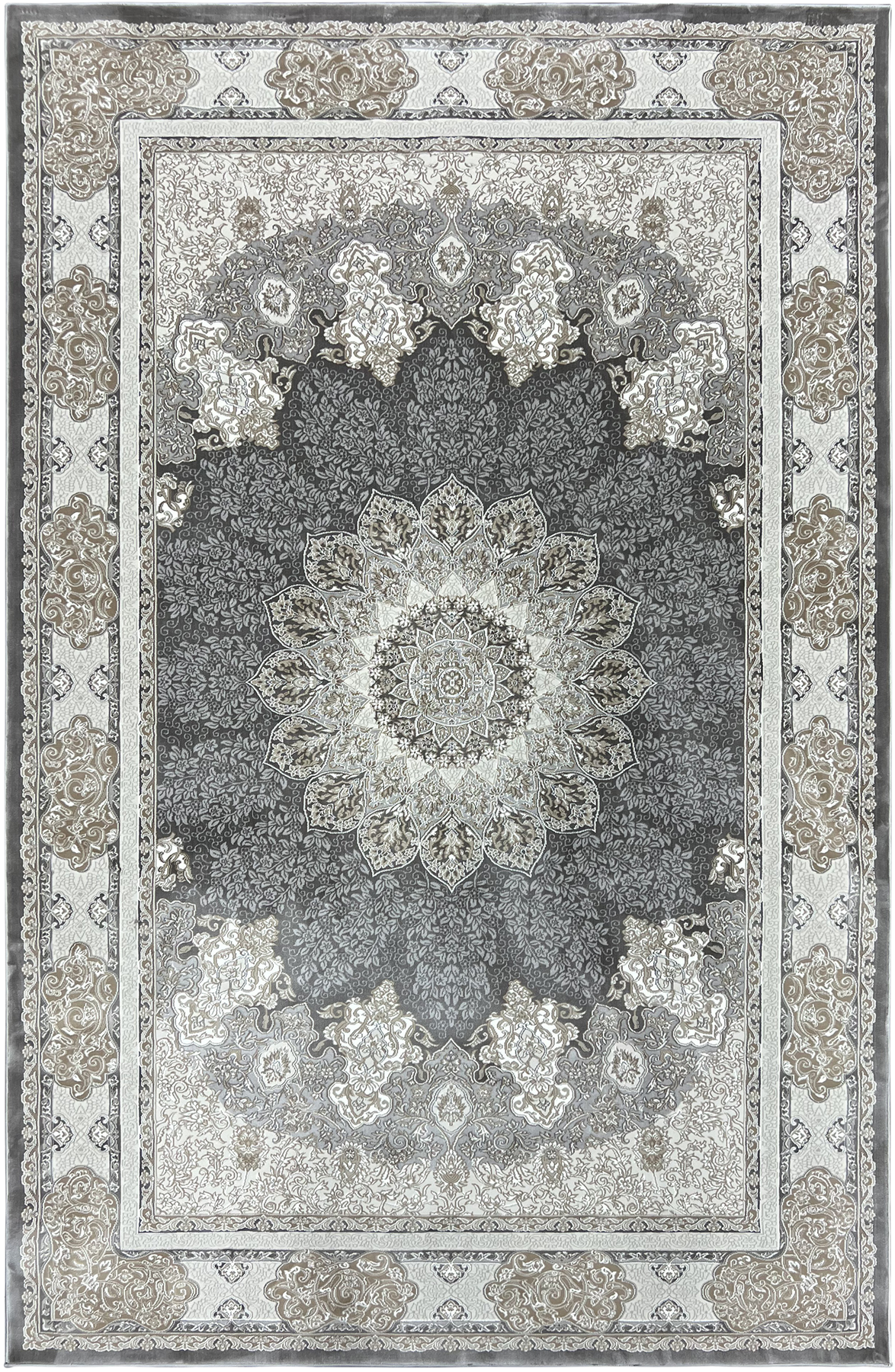 The Avangart 09 Grey rug presents a timeless elegance with its intricate traditional design. This exquisite piece features a grand central medallion, ornately detailed with floral and vine patterns, which radiates outward into a beautifully bordered field. The refined color palette primarily consists of various shades of light and dark grey, complemented by accents of ivory and hints of beige. This creates a sophisticated and harmonious look that evokes classic luxury.