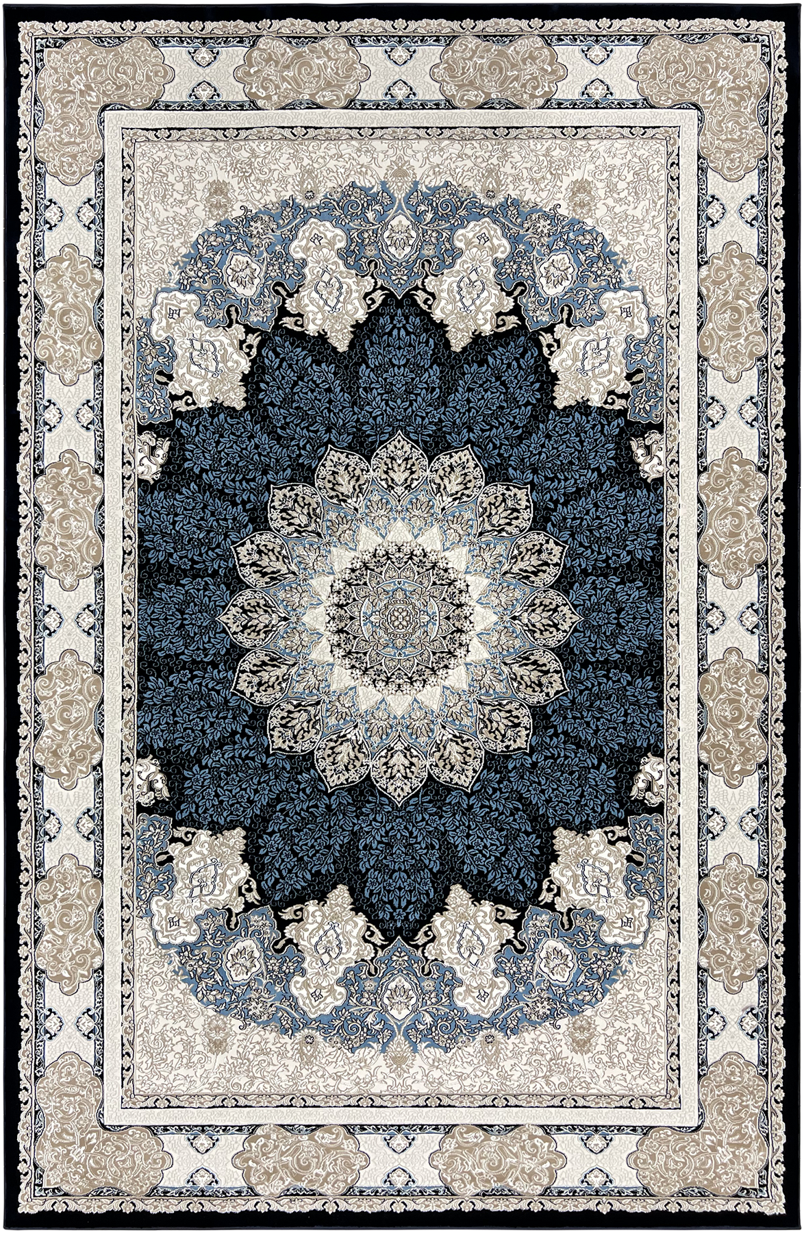 The Avangart 09 Navy rug presents a captivating take on classic elegance with its rich, traditional design. This exquisite piece features a grand central medallion, beautifully adorned with floral and vine patterns, which gracefully extends into a complementary bordered field. The striking color palette includes deep navy blue and varying shades of light blue, harmoniously blended with subtle accents of ivory and beige. This creates a sophisticated and regal look, evoking the refined heritage of antique textiles.