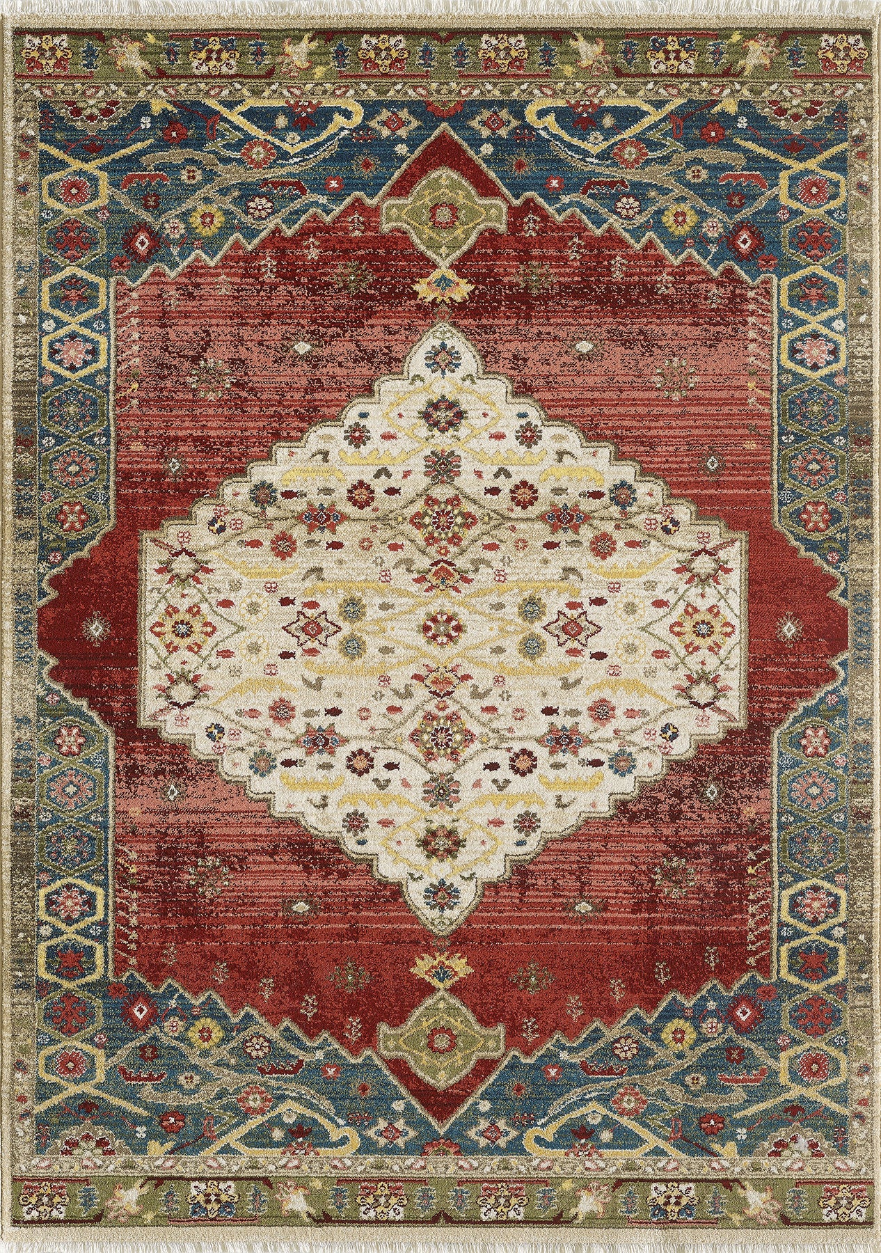 The Avant 37 Red rug offers a captivating take on traditional style with a modern, distressed finish. The design centers on a large, ornate medallion in a unique diamond shape, filled with delicate floral motifs. A series of layered borders frame the central pattern. The rug's rich red backdrop is artfully distressed, allowing its intricate beige, ivory, and blue details to come to life. The rug is finished with delicate fringe, which adds to its sophisticated, handcrafted appeal.