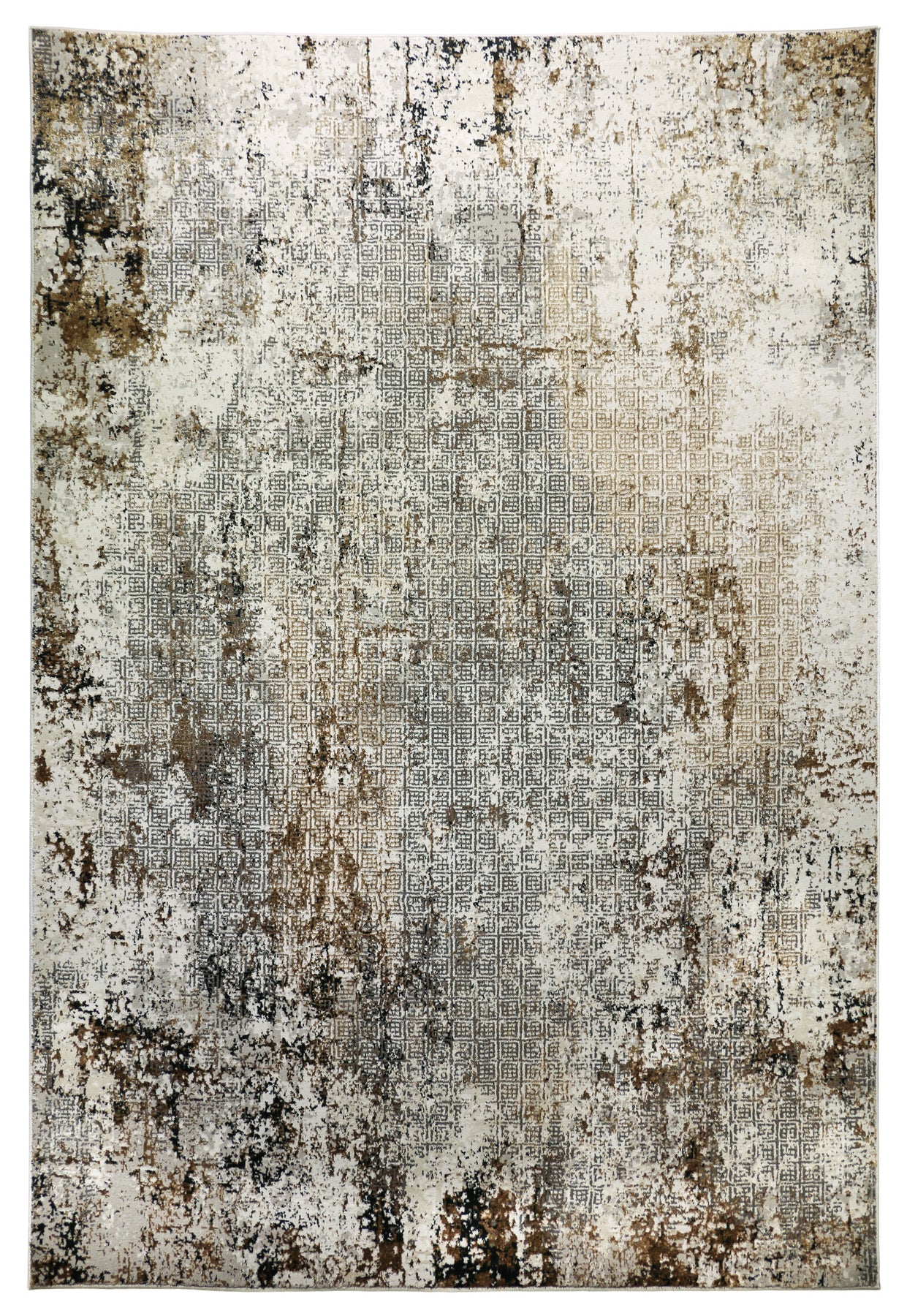 The Belfast 02 Brown rug is a sophisticated piece of modern art with a nuanced, multi-layered design. The central area is a complex mosaic of small grey and brown squares, each containing its own intricate pattern, all set against a soft grey background. This detailed core is elegantly bordered by a distressed frame, where rich tones of brown, taupe, black, and beige intermingle to create a subtle yet compelling contrast.