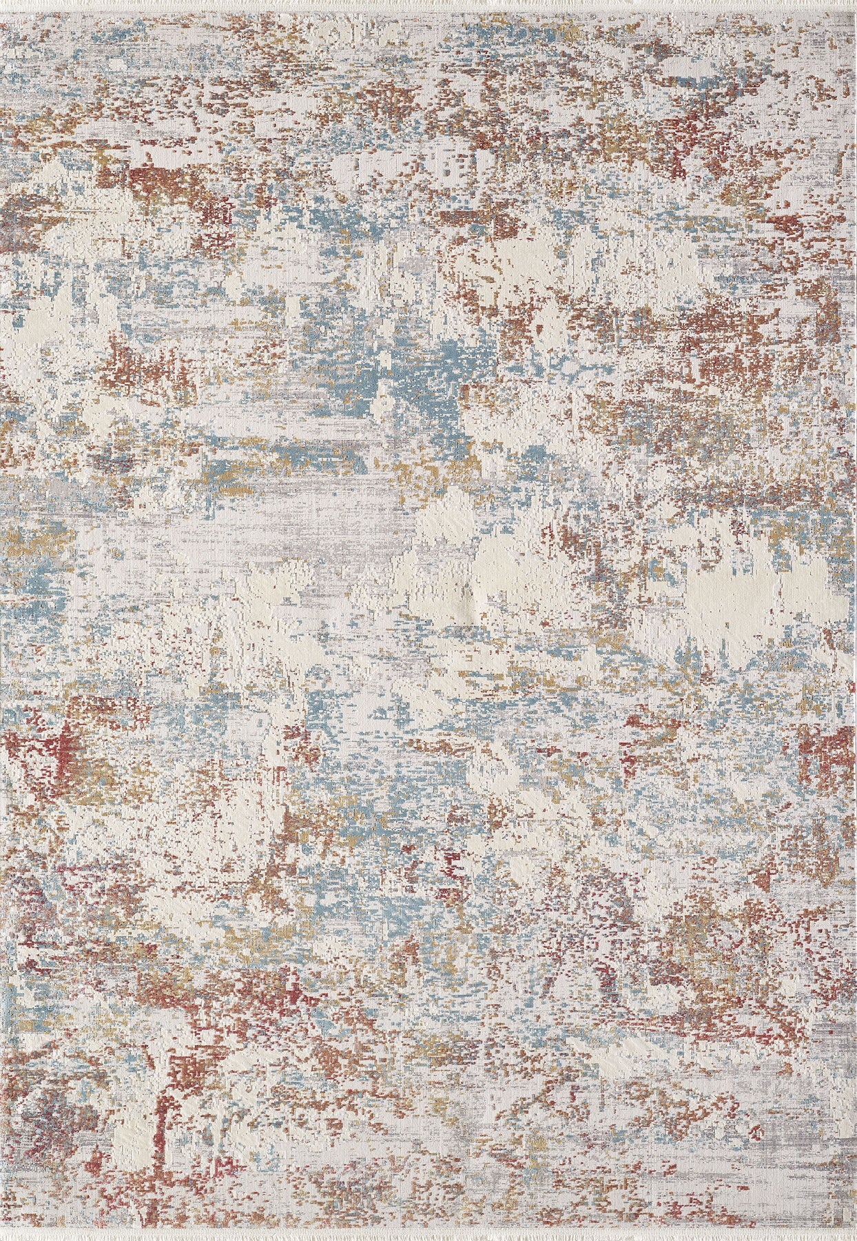 The Berkshire 18C rug is a striking piece of floor art, featuring a soft, abstract design that evokes the layered, textural look of a weathered fresco. The color palette is rich and scattered, blending sky blue, terracotta red, golden beige, ivory, and hints of grey in a non-linear, organic pattern that creates profound depth.
