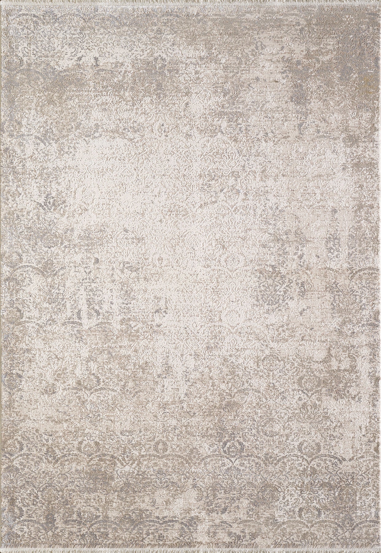 The Berkshire 41 rug presents a timeless design beautifully updated with a contemporary, distressed finish. This piece features a faded traditional pattern where the subtle outlines of a classic medallion and border emerge gracefully beneath a highly textured, worn-in layer. The color palette is exceptionally soft and versatile, with the design rendered in tone-on-tone washes of light taupe and soft beige against a bright ivory background.