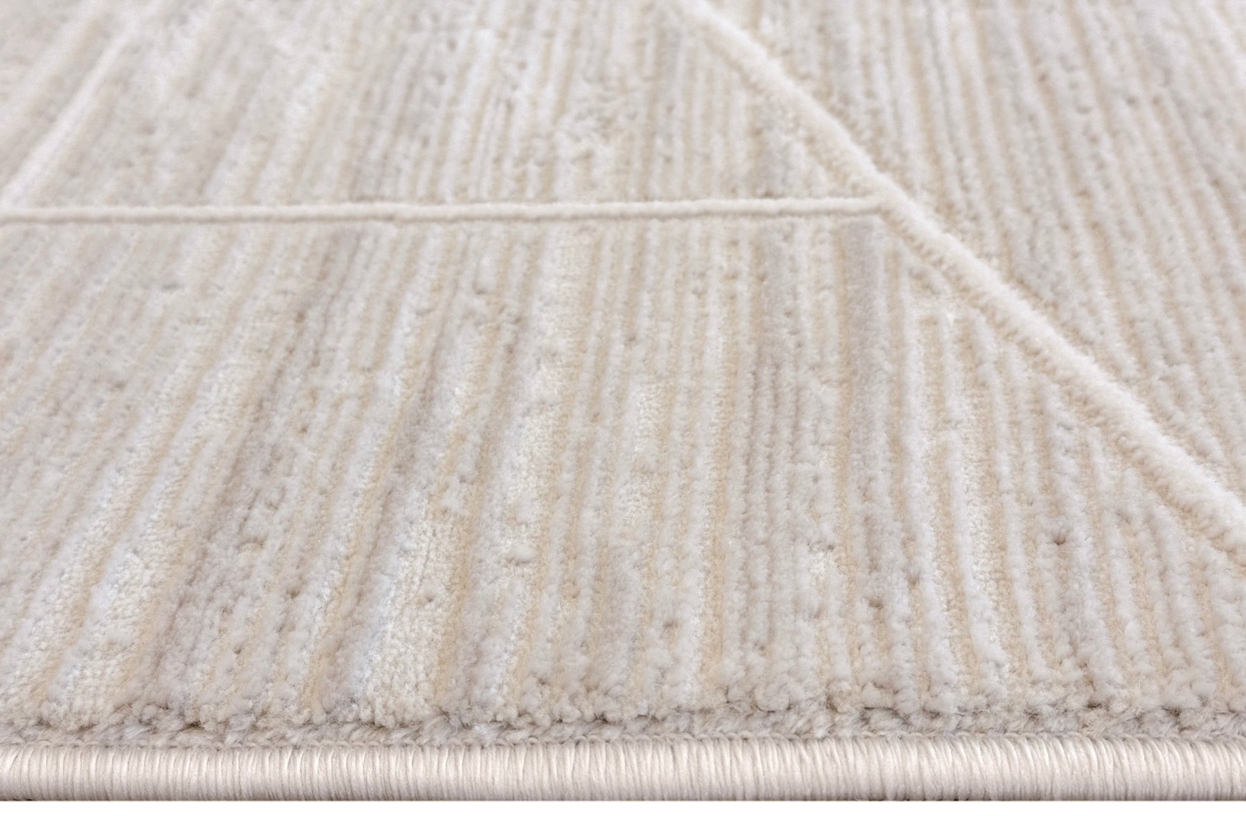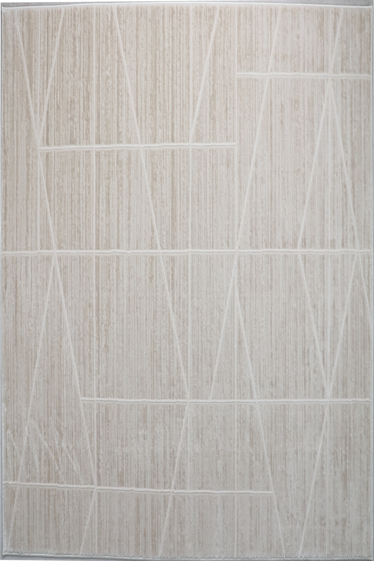 Brooke 754 showcases a captivating modern design with a bold, abstract geometric pattern. A network of clean, intersecting white lines creates a dynamic composition of triangles, rectangles, and irregular shapes. This striking line-work is set against a beautifully textured background of soft cream and warm light beige, which features a subtle, vertical grain. The design's sophisticated structure and neutral palette provide a powerful yet refined focal point for any room.