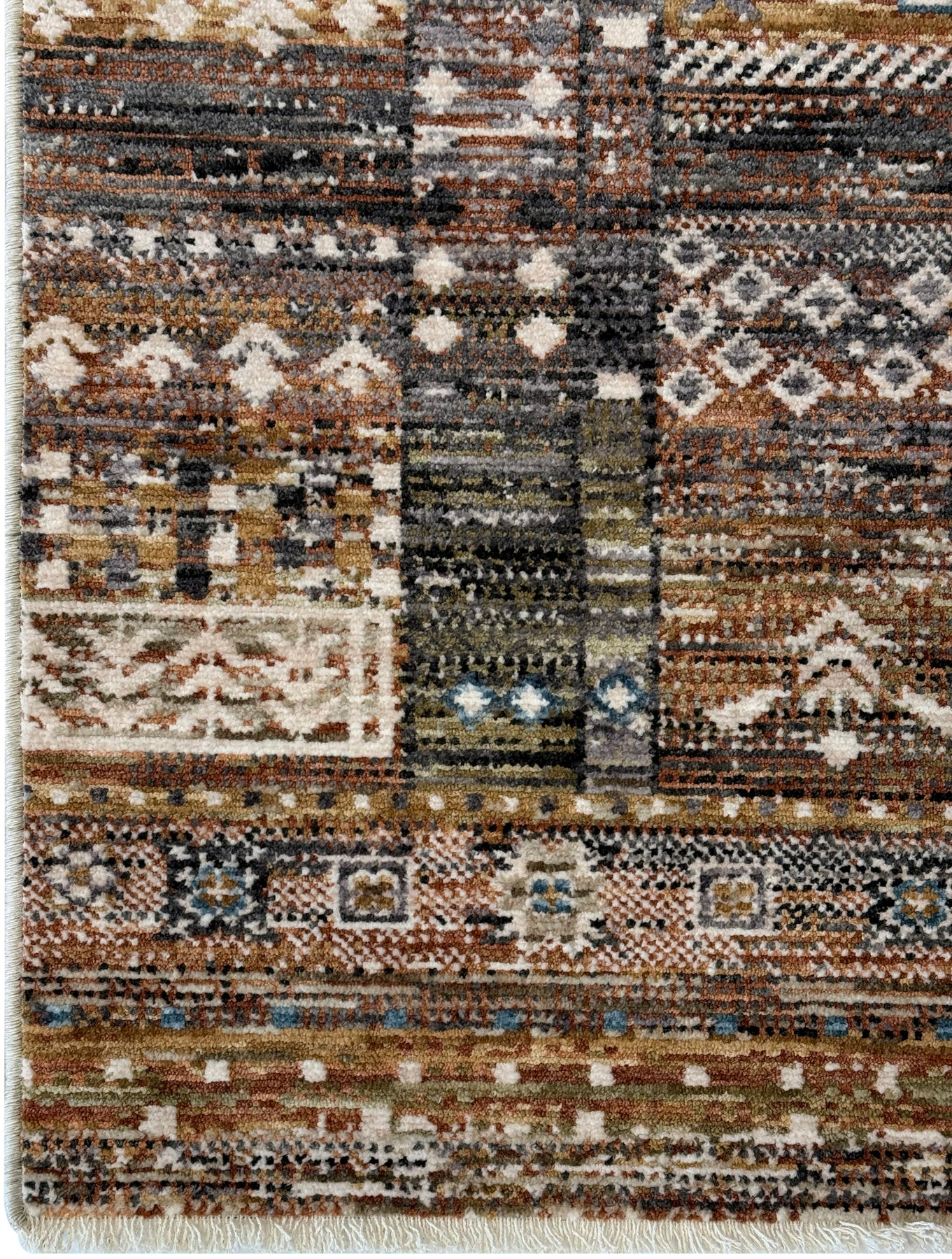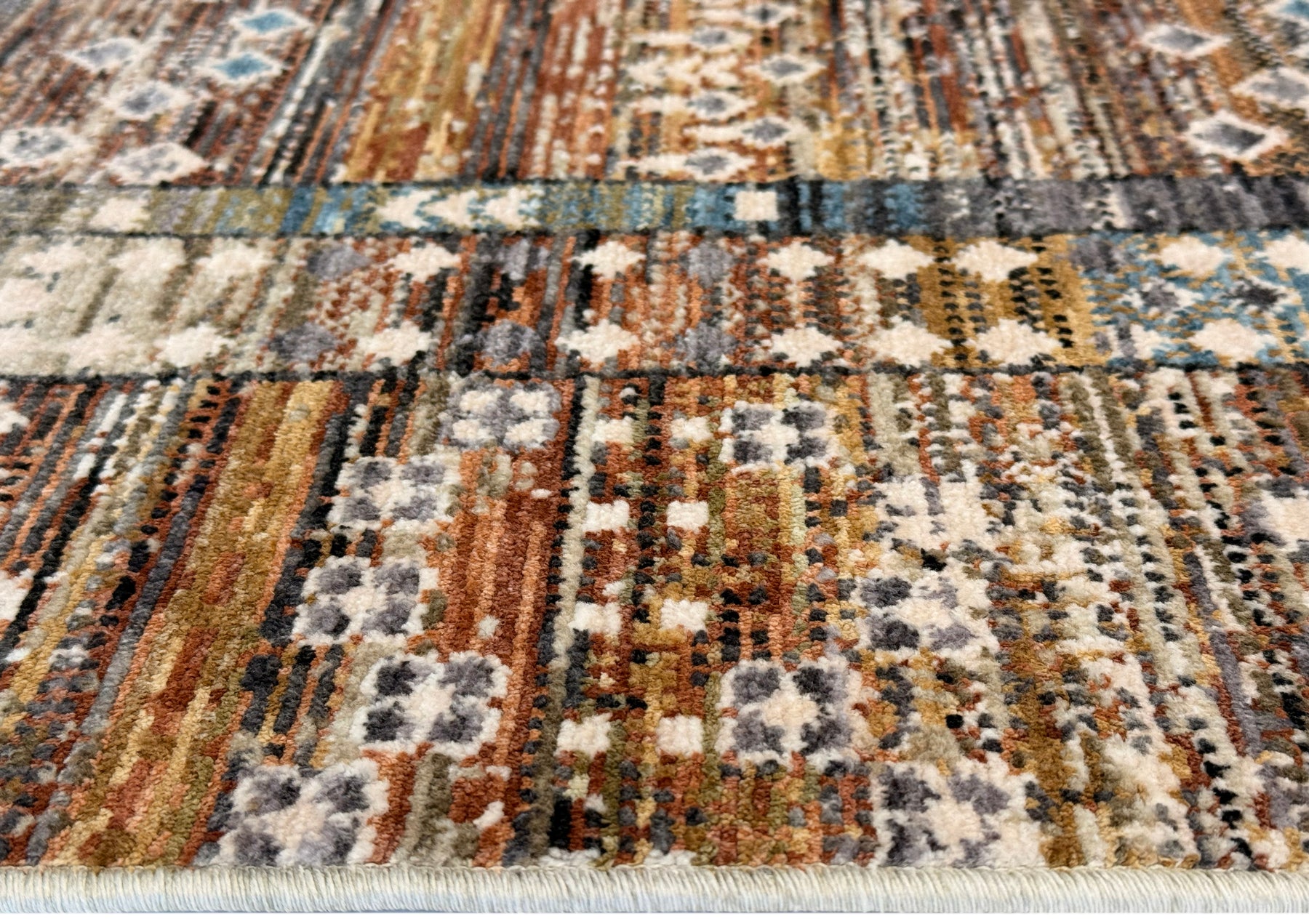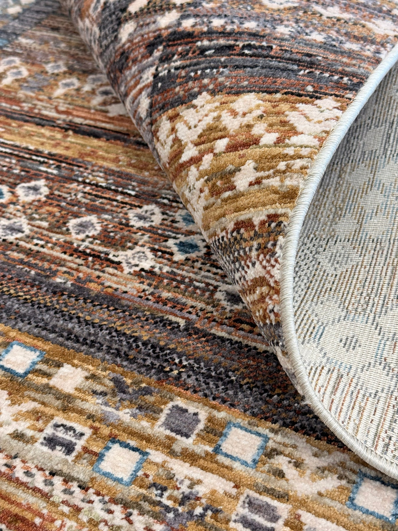 The Iris design brings warmth and depth through its rich terracotta tones, softened by touches of olive green, blues and warm neutrals. The pattern is tribal-inspired with layered motifs that feel collected and storied rather than structured or geometric.