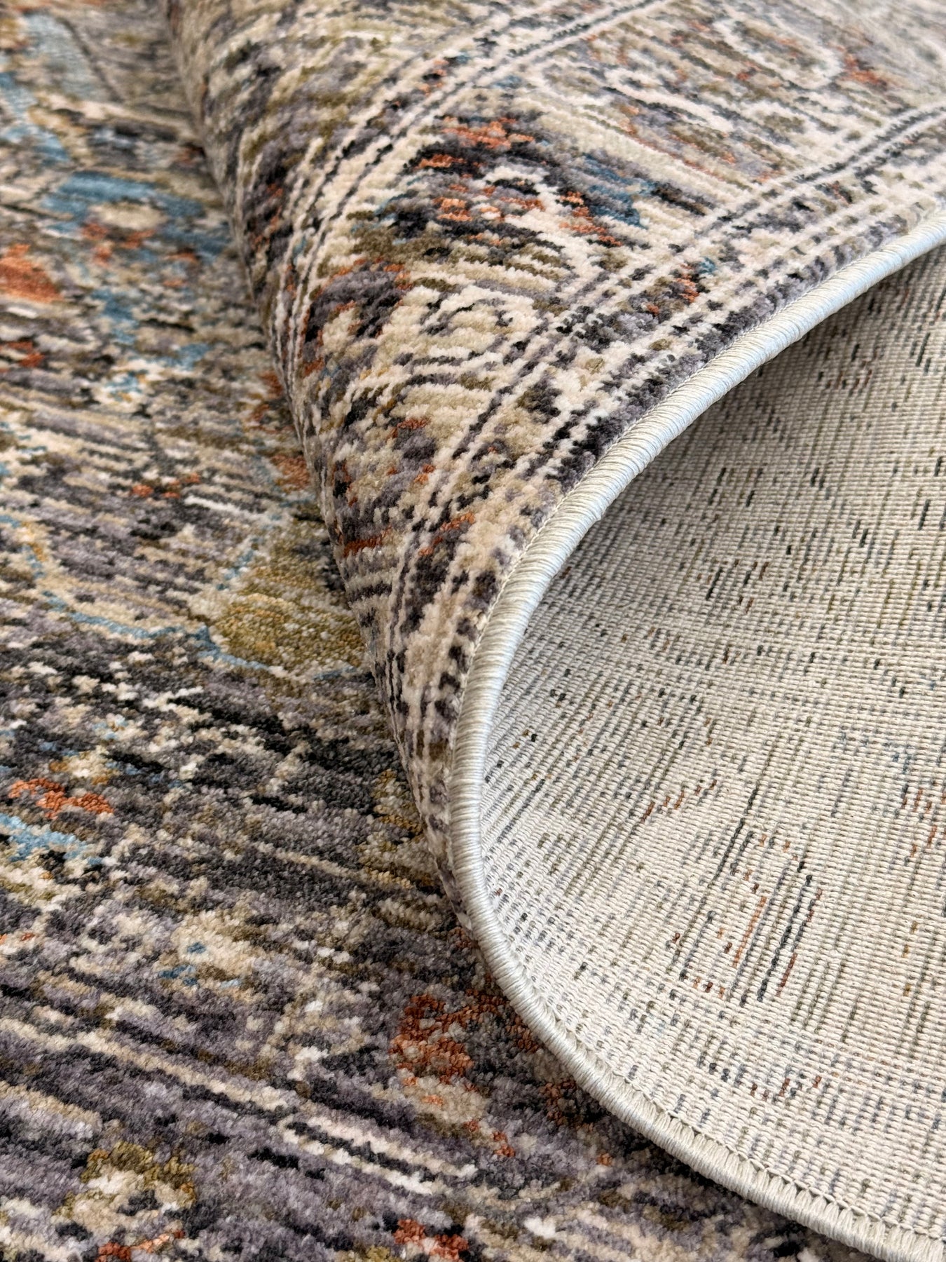 Warm beige and ivory tones form the foundation, enriched with earthy terra, muted rust, soft charcoal, olive undertones, and subtle hints of denim blue. The close-up detailing reveals gentle colour striations that add dimension and depth, giving the rug a rich, textured appearance without overwhelming the space.