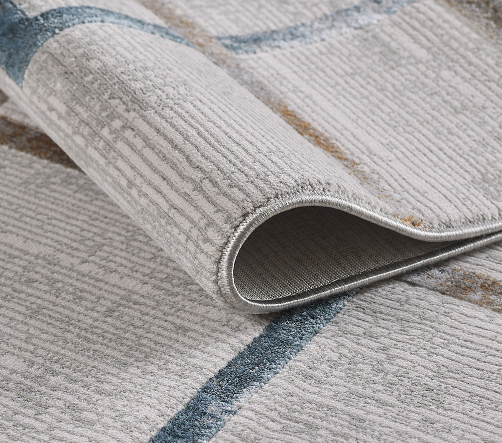 The Alchemy 07A rug features a clean, contemporary design with overlapping geometric shapes. Its pattern is created by soft blue and muted gold rectangular outlines that intersect at varying angles across a textured light grey background. This unique layering gives the rug a subtle, architectural feel. The overall effect is minimal yet stylish, making it a sophisticated addition to modern or minimalist interiors.