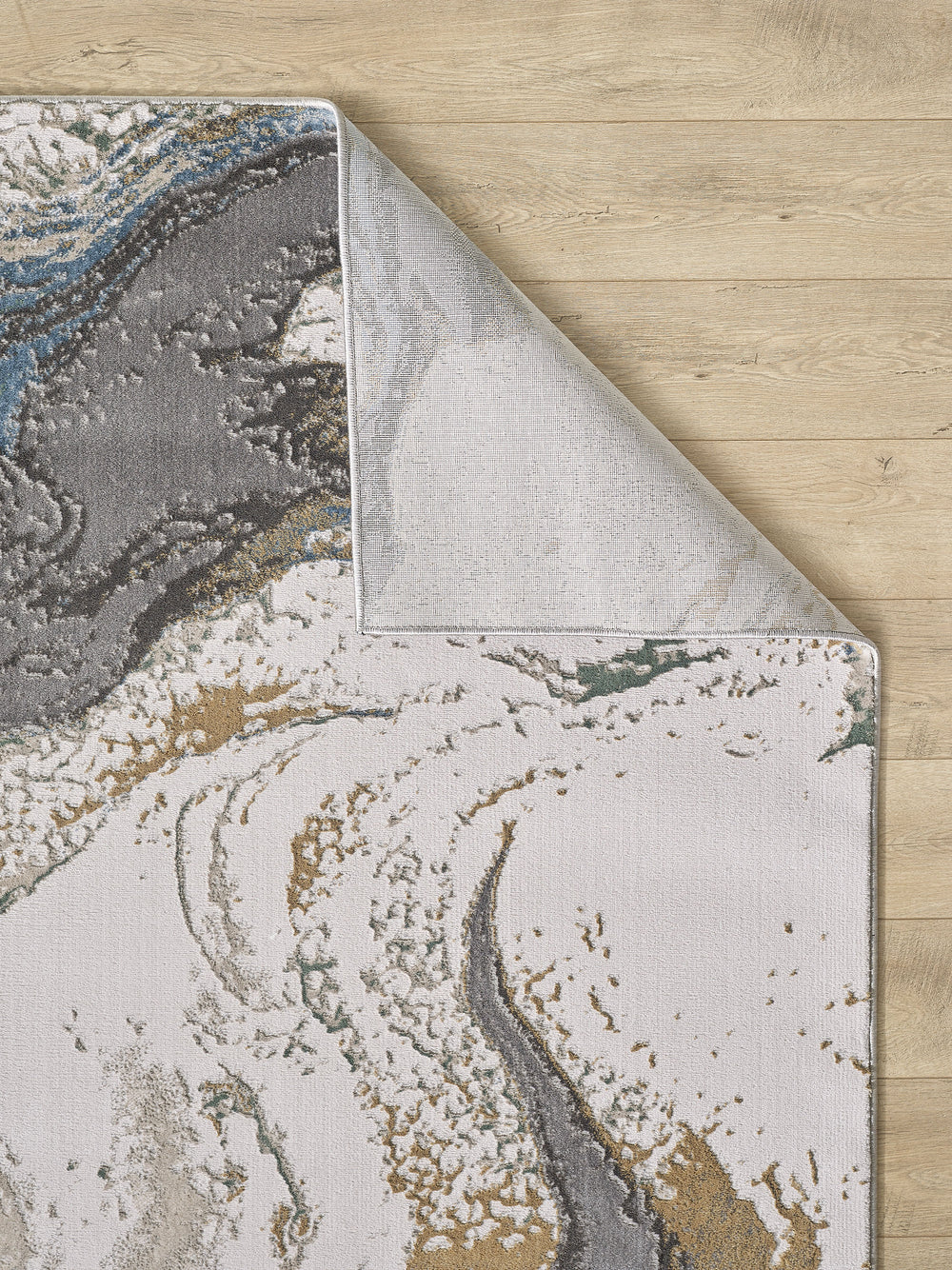 The Alchemy 26A rug features a fluid, organic design that mimics the natural flow of marble and riverbeds. Swirling lines and layered textures create a sense of movement and depth, as if you're looking at mineral strata or eroded stone. A calming color palette of gray, off-white, and taupe forms the base, while accents of charcoal, mustard gold, forest green, and hints of blue blend in seamlessly to create a modern, abstract composition.