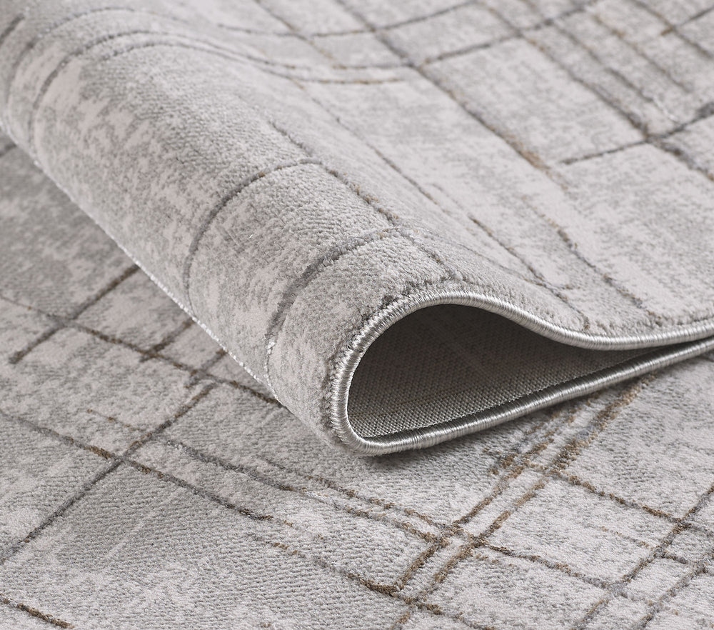The Alchemy 88A rug brings a quiet, modern aesthetic to your space with its minimalist abstract design. The rug features a pattern of intersecting linear patterns in soft shades of grey and brown. Set against a subtly textured, light grey background, the overlapping lines vary in thickness and spacing, creating a dynamic, architectural rhythm. The overall effect is clean and contemporary, making it a versatile addition to any room.