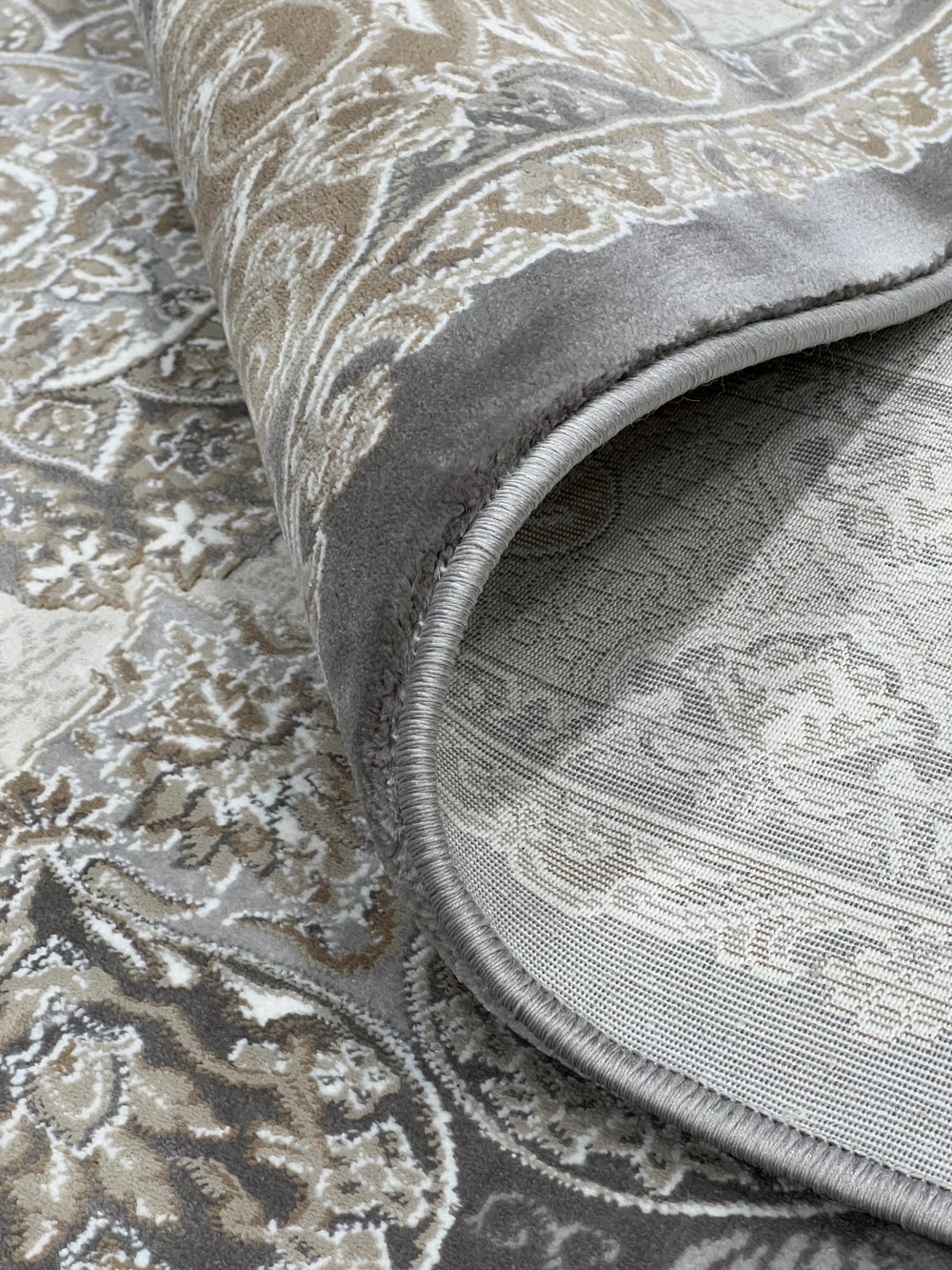 The Avangart 09 Grey rug presents a timeless elegance with its intricate traditional design. This exquisite piece features a grand central medallion, ornately detailed with floral and vine patterns, which radiates outward into a beautifully bordered field. The refined color palette primarily consists of various shades of light and dark grey, complemented by accents of ivory and hints of beige. This creates a sophisticated and harmonious look that evokes classic luxury.