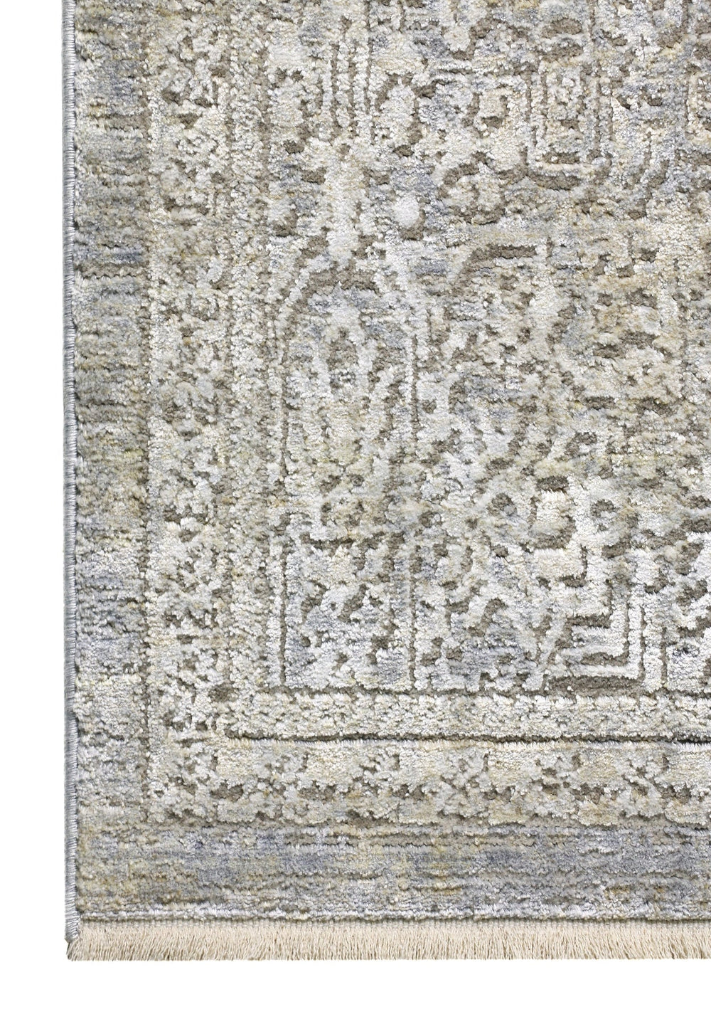 The Azure 46 rug presents a timeless design with a gracefully faded and elegant aesthetic. The rug’s surface features a subtle, embossed medallion pattern that is beautifully understated. Its intricate motifs appear to gently recede, creating a sophisticated textural look. The delicate color palette blends soft grey, light cream, and warm beige tones, making it an effortlessly chic foundation for any space.