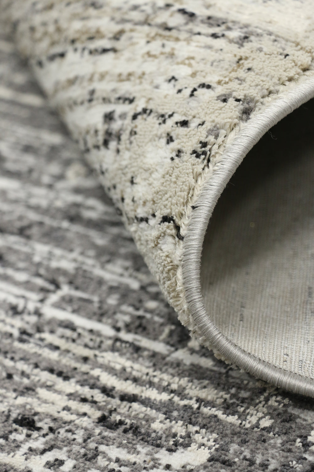 The Belfast 84B rug makes a bold, artistic statement with its abstract, distressed design. Its surface features a compelling pattern of horizontal streaks in deep charcoal and black, contrasting beautifully against a light grey background. This striking visual creates a sense of modern artistry and texture, providing a powerful focal point for any room.