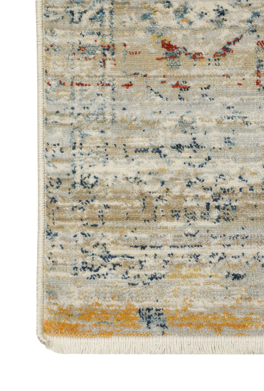 Colours found in this Bogota area rug include cream, taupe, arctic blues, red/orange and soft golds.