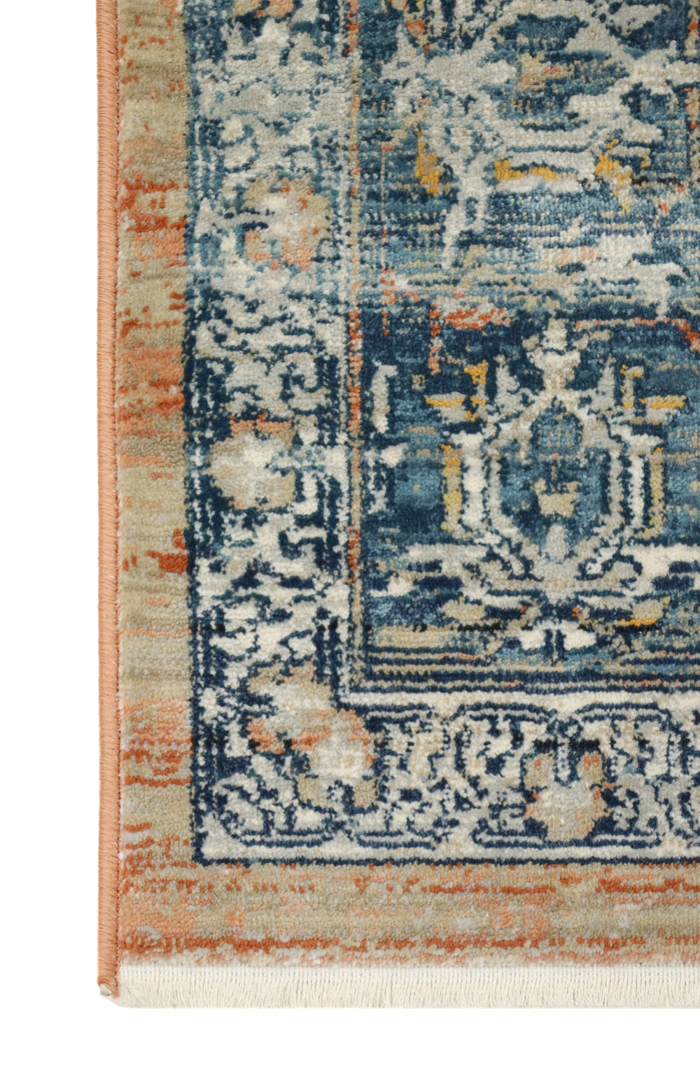The Bogota 87/42 rug makes a warm, high-impact statement with its beautiful, faded traditional medallion design. The classic central medallion and border are detailed yet softened by an artfully distressed finish, giving the piece a rich, storied character. The vibrant color palette is dominated by earthy terracotta rust and warm orange, beautifully complemented by muted shades of navy blue, slate blue, and golden beige.