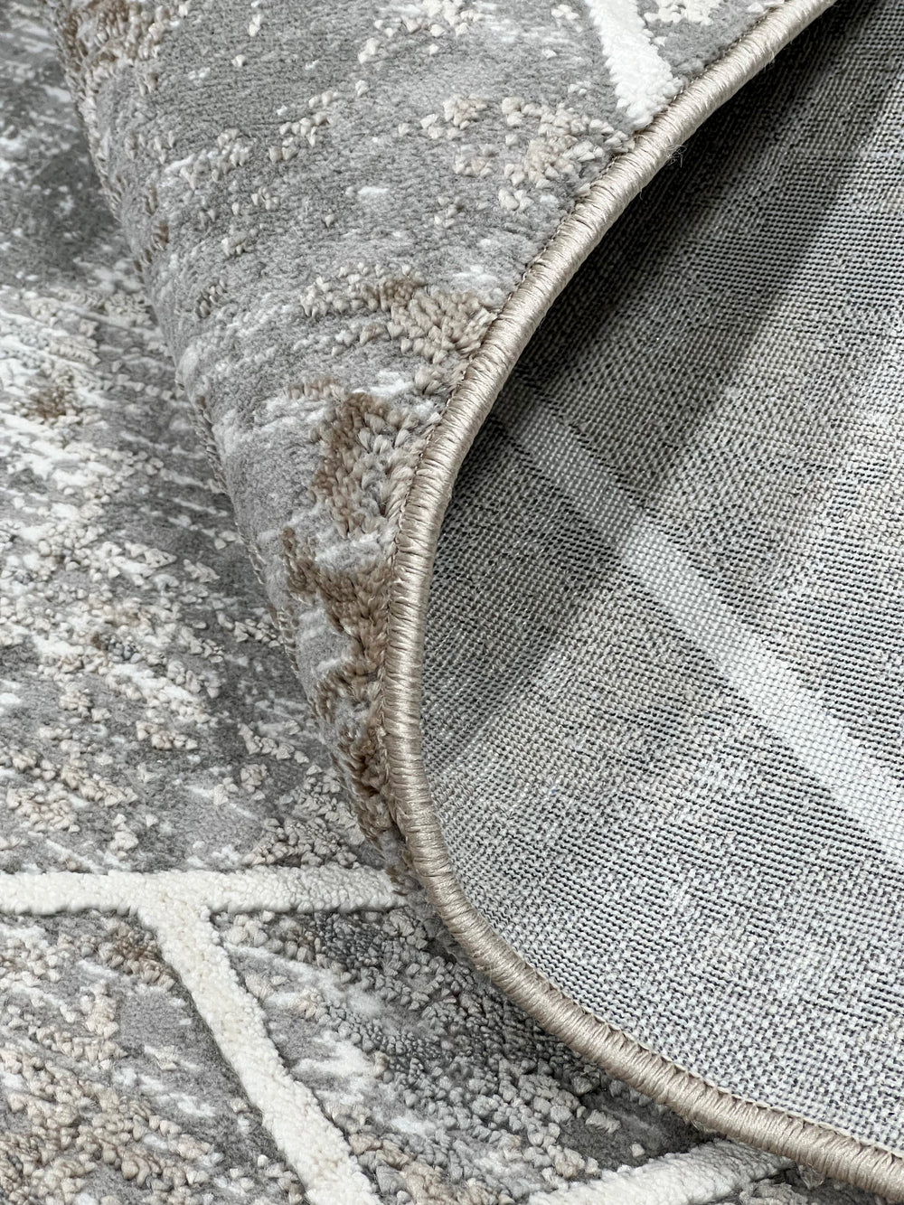 Brooke 190 showcases a dynamic and sophisticated modern design, merging a distressed abstract backdrop with a sharp geometric pattern. The rug's surface features a mottled, painterly texture in a versatile blend of light grey, soft beige, and taupe tones. This rich background is overlaid with a network of crisp, intersecting white lines, creating a striking sense of depth and architectural flair.