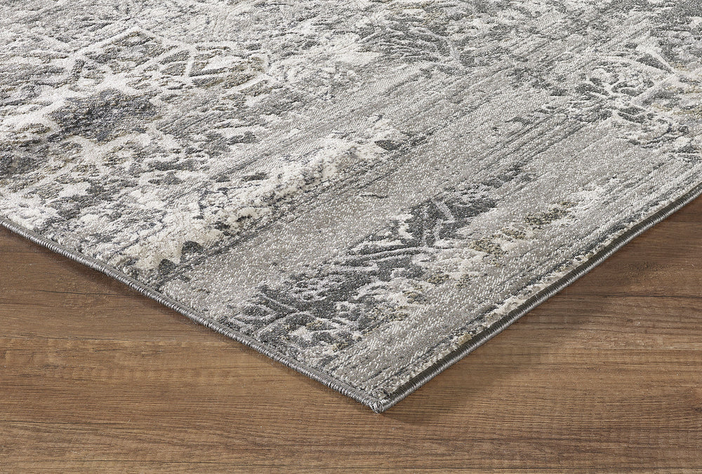 This design from the Ginza Collection strikes a balance between tradition and edge. This striking piece features a layered, distressed motif inspired by timeworn textiles, reimagined in a modern palette of charcoal, ivory, taupe, and soft hints of tan.