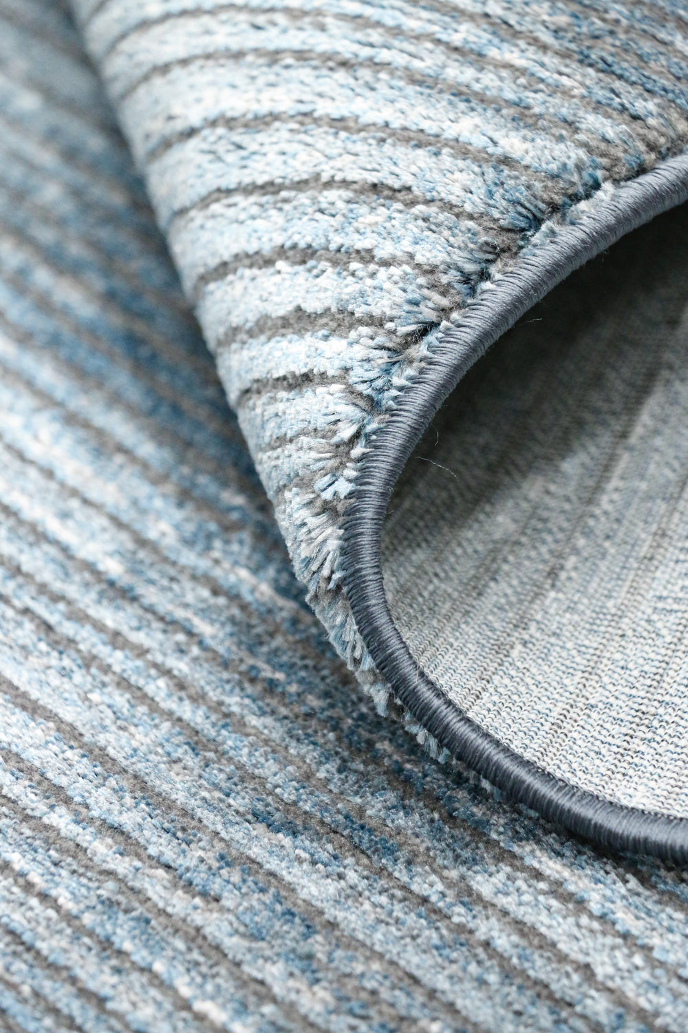 The Glasgow 82 Blue rug offers a minimalistic and refined design with a unique tactile feel. Its surface features a beautiful, multi-tonal palette of blues and navy that are woven to create a striking linear, high-low texture. This subtle pattern adds a sense of depth and movement, providing a clean, contemporary foundation that complements a variety of decor styles.