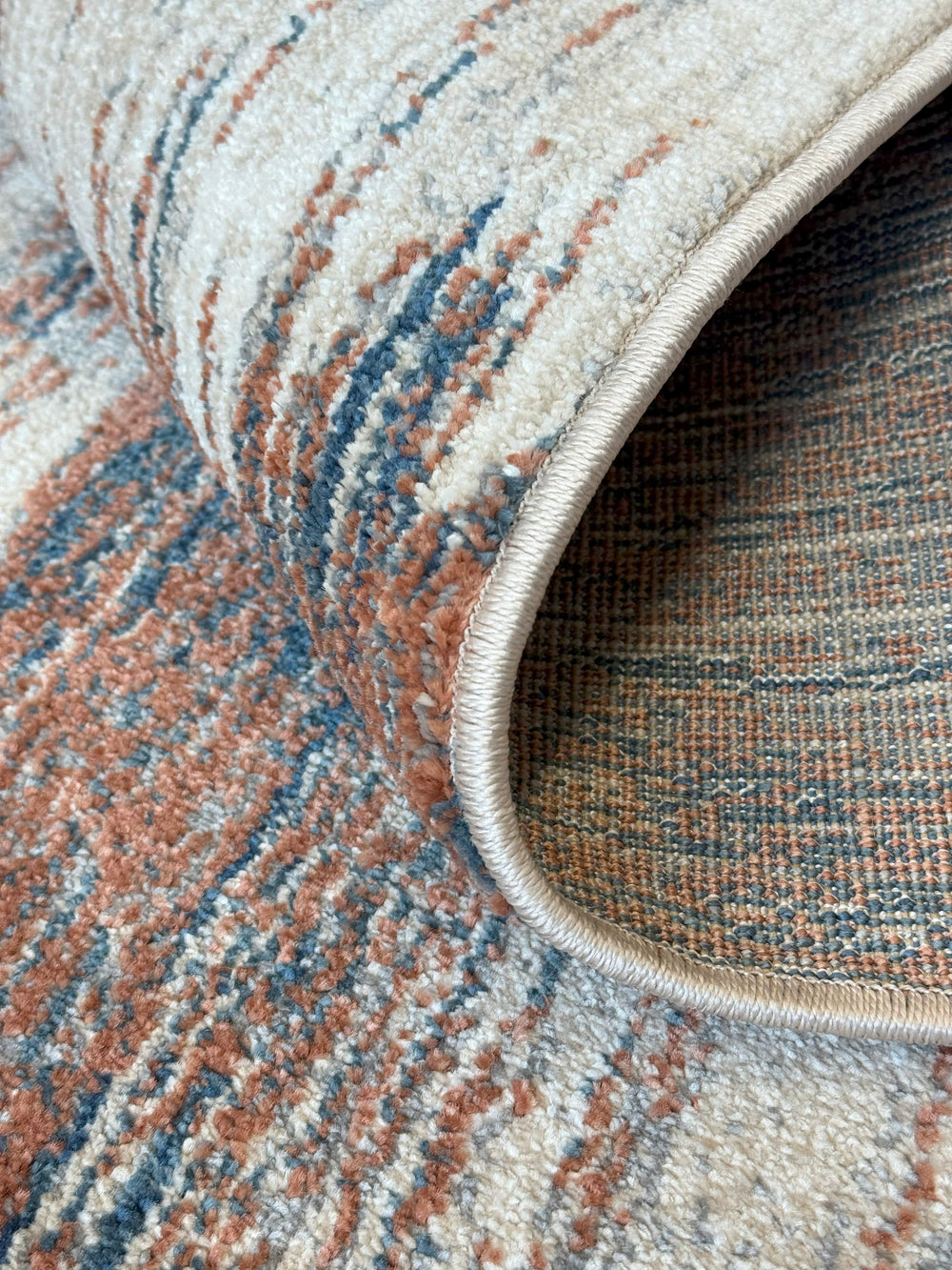 Mojave 493 features bold strokes of rust and navy blue layered across a soft beige background. The abstract pattern creates a sense of depth and energy while still feeling refined and balanced. Its warm and cool tones blend seamlessly to suit both vibrant and neutral spaces.