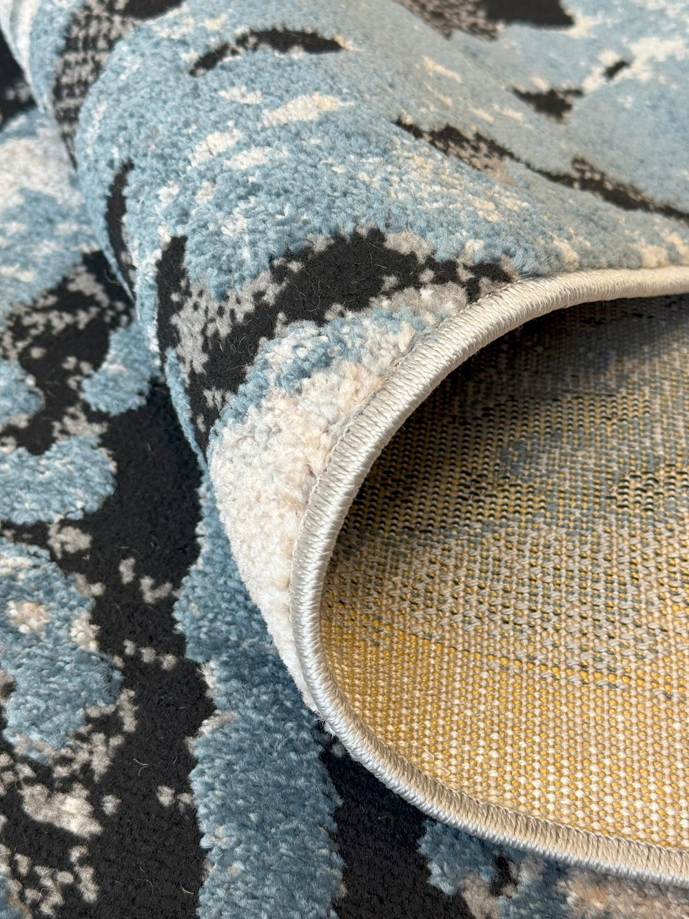 Monty 239 Beige/L.Grey captures the fluid beauty of natural stone with a dramatic marbled pattern. Swirling layers of beige, light grey, black, and slate blue flow across the surface, creating a bold yet calming effect. The contrast between light and dark tones adds depth and movement, while the soft palette keeps the look grounded and versatile.