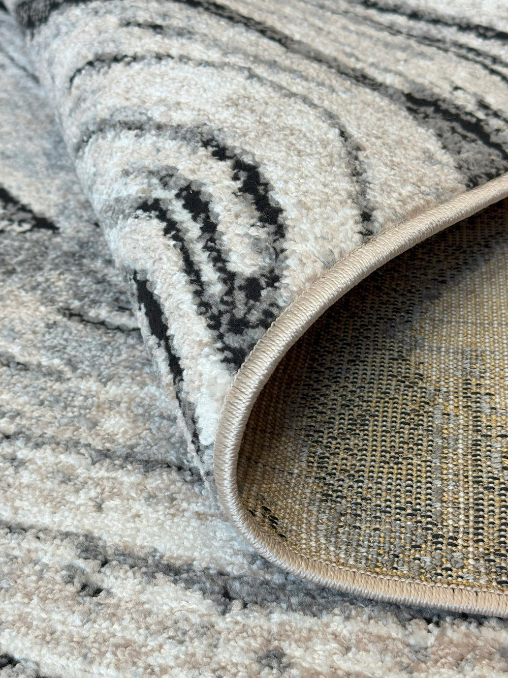 Monty 241 Beige/L.Grey captures the natural beauty of flowing stone and water with its soft, marble-inspired pattern. Wavy layers of beige, light grey, and charcoal ripple across the surface, creating a sense of calm movement and texture. The design feels organic and fluid, while the neutral palette keeps it versatile and easy to style.