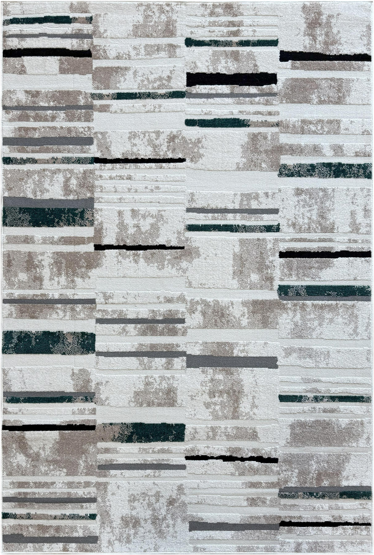 Monty 134 Beige/Cream blends earthy tones with modern rhythm. Soft taupe, cream, charcoal, and deep green bars are layered across a textured beige base, creating a linear pattern that feels dynamic yet grounded. The varied striping gives a subtle sense of motion, while the muted palette keeps the look refined and versatile.