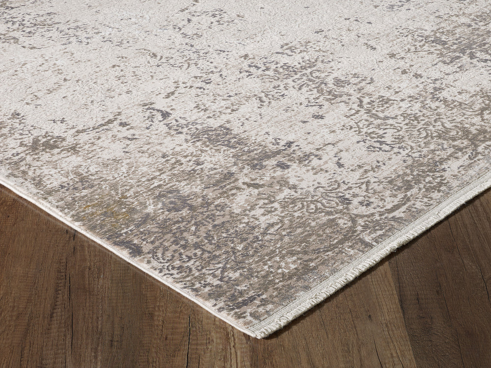 The Berkshire 41 rug presents a timeless design beautifully updated with a contemporary, distressed finish. This piece features a faded traditional pattern where the subtle outlines of a classic medallion and border emerge gracefully beneath a highly textured, worn-in layer. The color palette is exceptionally soft and versatile, with the design rendered in tone-on-tone washes of light taupe and soft beige against a bright ivory background.