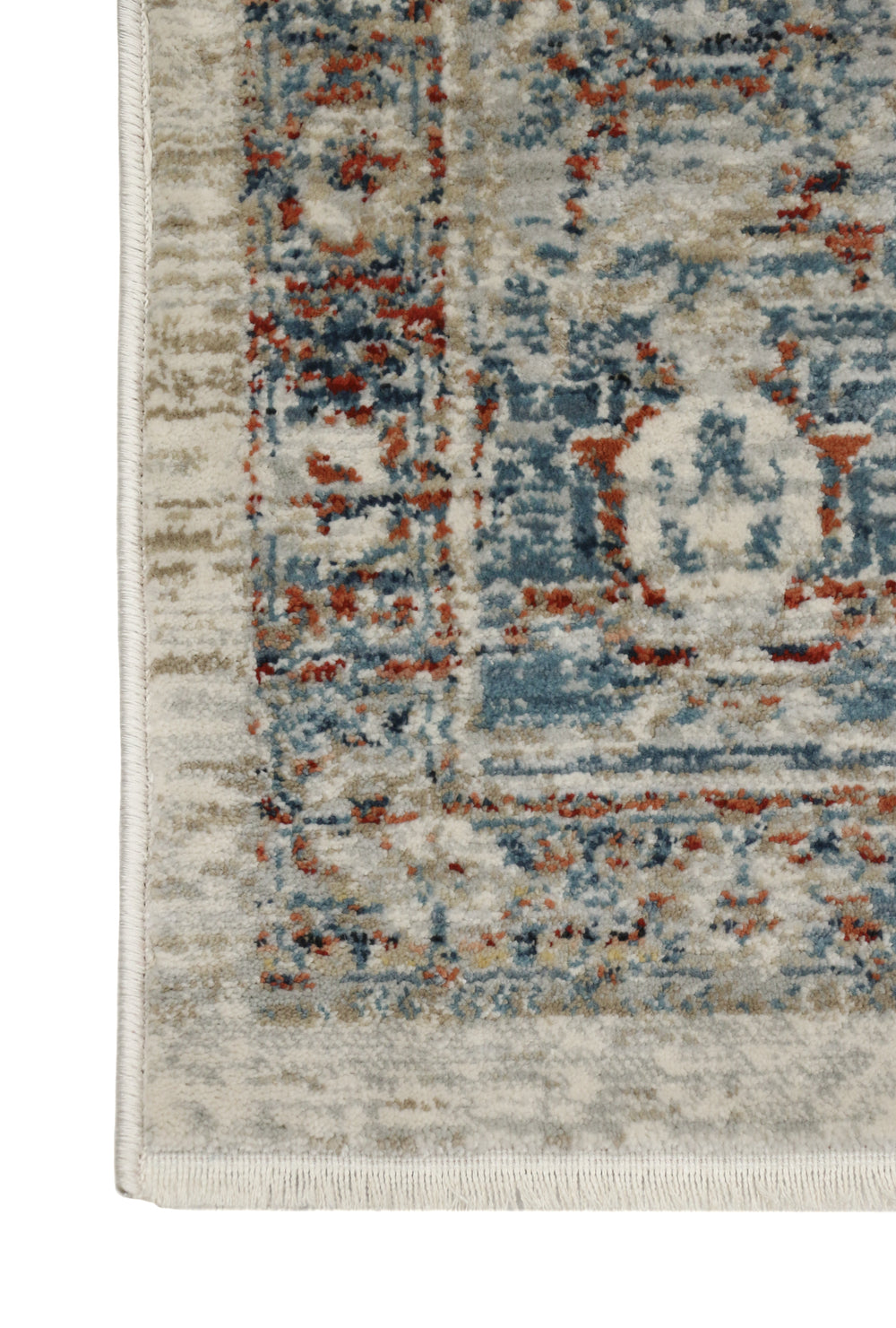 The Bogota 87/72 rug offers a stunning take on faded traditional design, featuring a beautifully detailed central medallion and complementary border. The pattern is softened by an artfully distressed finish, giving the rug the rich character of a vintage heirloom. Its sophisticated, multi-tonal palette blends cool shades of slate blue and deep navy with warm accents of terracotta rust, all set against a luminous taupe and pale beige background.