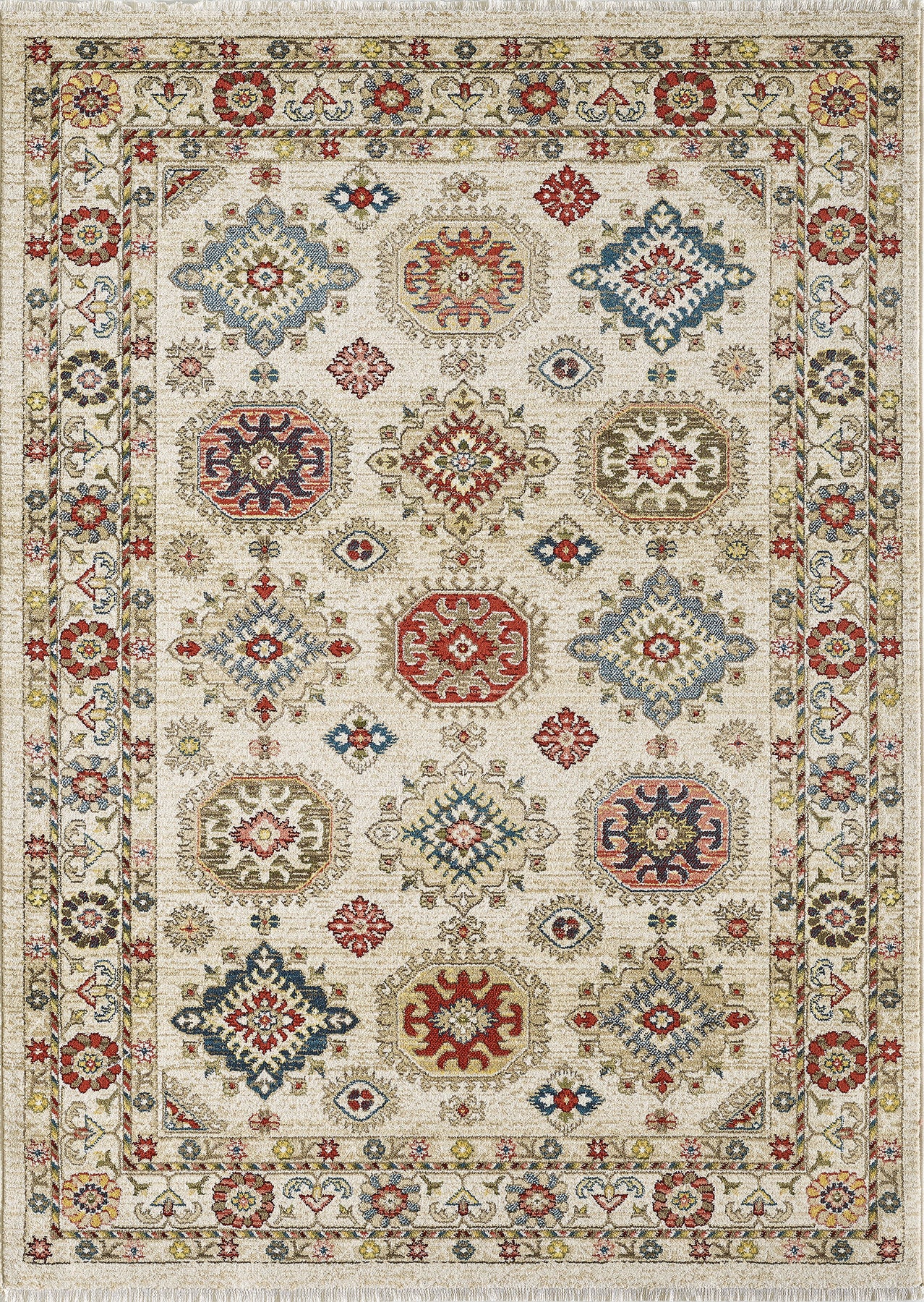 The Avant 60 Cream rug offers a playful and vibrant take on a traditional design. Its field features a collection of beautifully detailed, geometric medallions and stylized floral motifs that are intricately scattered across the surface. A classic, ornate border frames the rug, which is finished with delicate fringe on either end. The rug's warm cream base is perfectly complemented by a diverse palette of colors, including vibrant red, calm blue, and earthy beige tones.