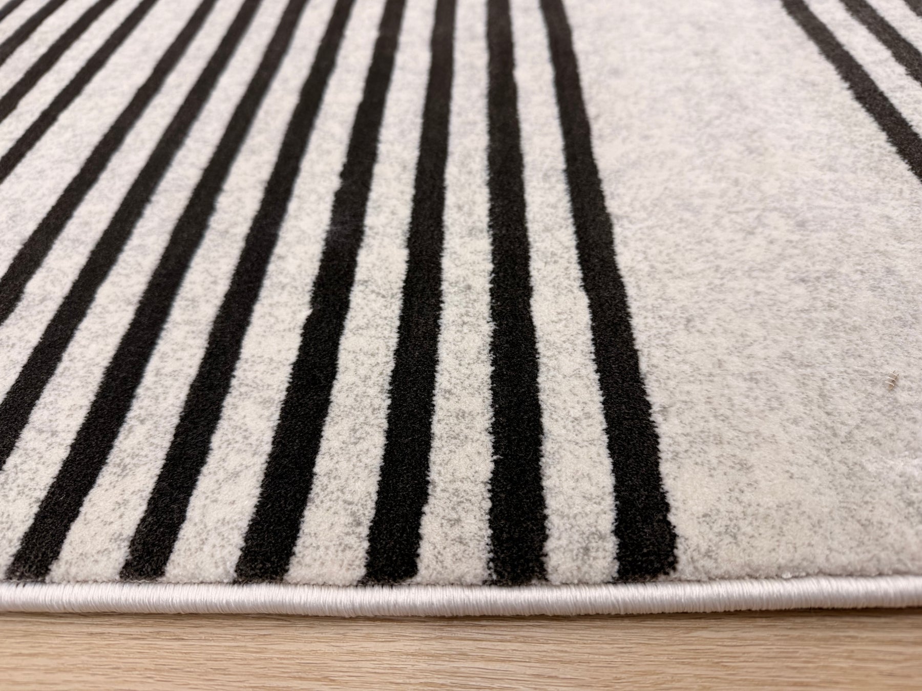 This rug features a striking pattern of lined arches in bold dark brown and black, gracefully set against a stone white with specks of light grey background. The juxtaposition of these contrasting colors creates a visually dynamic and eye-catching focal point for any room.