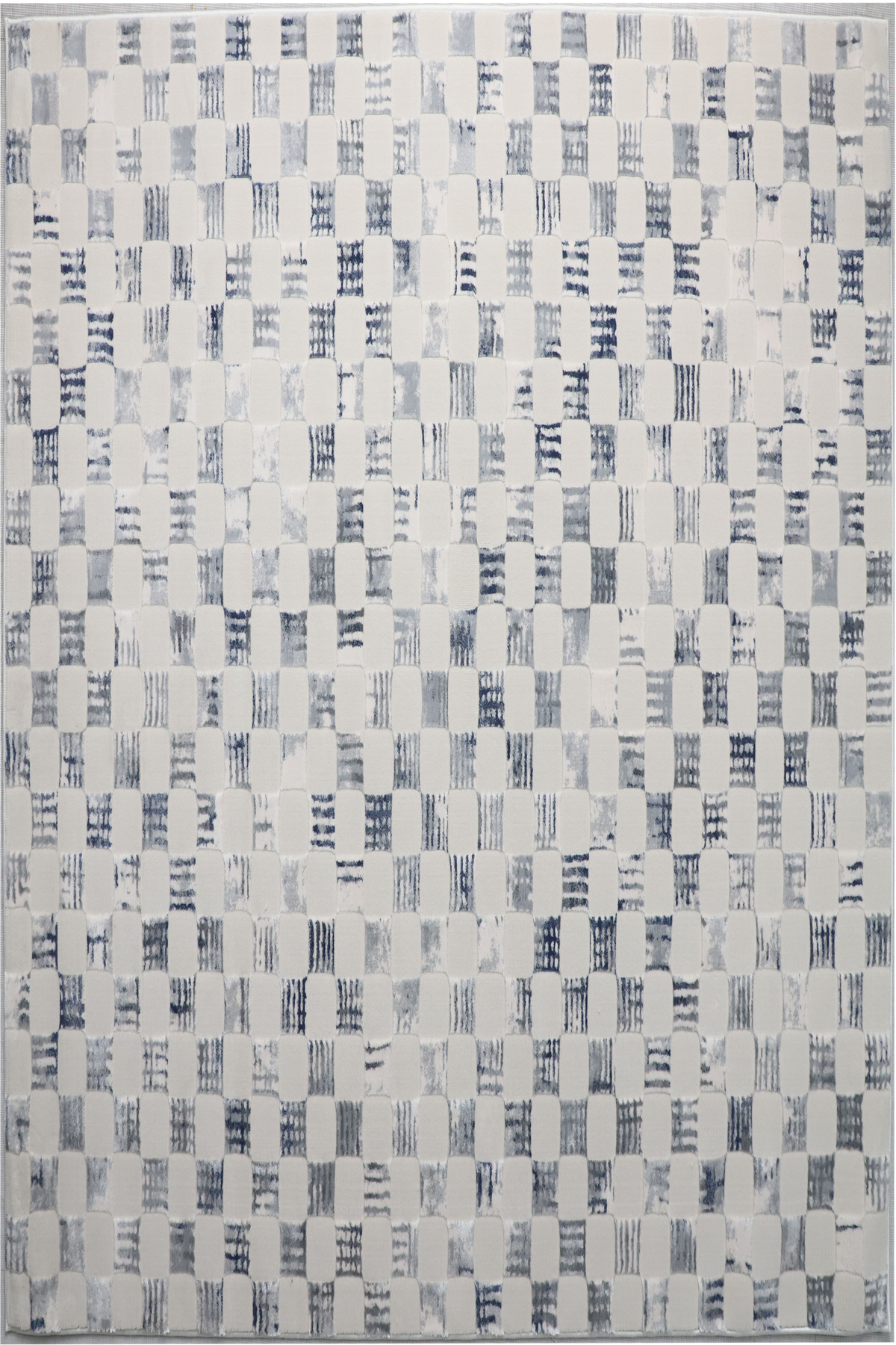 Brooke 751 Cream/Blue features a captivating and modern checkered design with an artisanal, hand-stamped feel. The pattern showcases a series of structured squares in a soft, muted blue, beautifully distressed against a serene cream and ivory background. This layered effect creates a sense of both playful rhythm and sophisticated texture, bringing a fresh, contemporary aesthetic to any space.