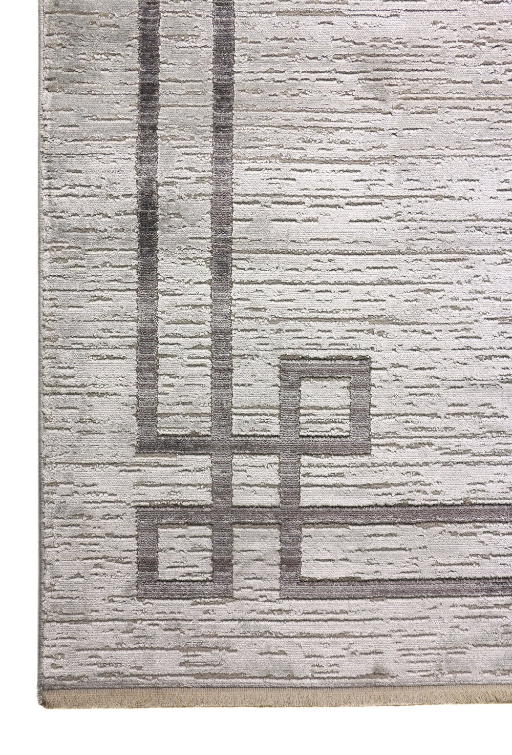 The Azure 539 rug embodies a refined, minimalistic elegance with its beautiful vintage-inspired border. A simple yet sophisticated charcoal border frames a stunning textured background that blends tones of luminous silver and warm beige. The overall design is understated, allowing its subtle beauty and intricate texture to elevate any room.