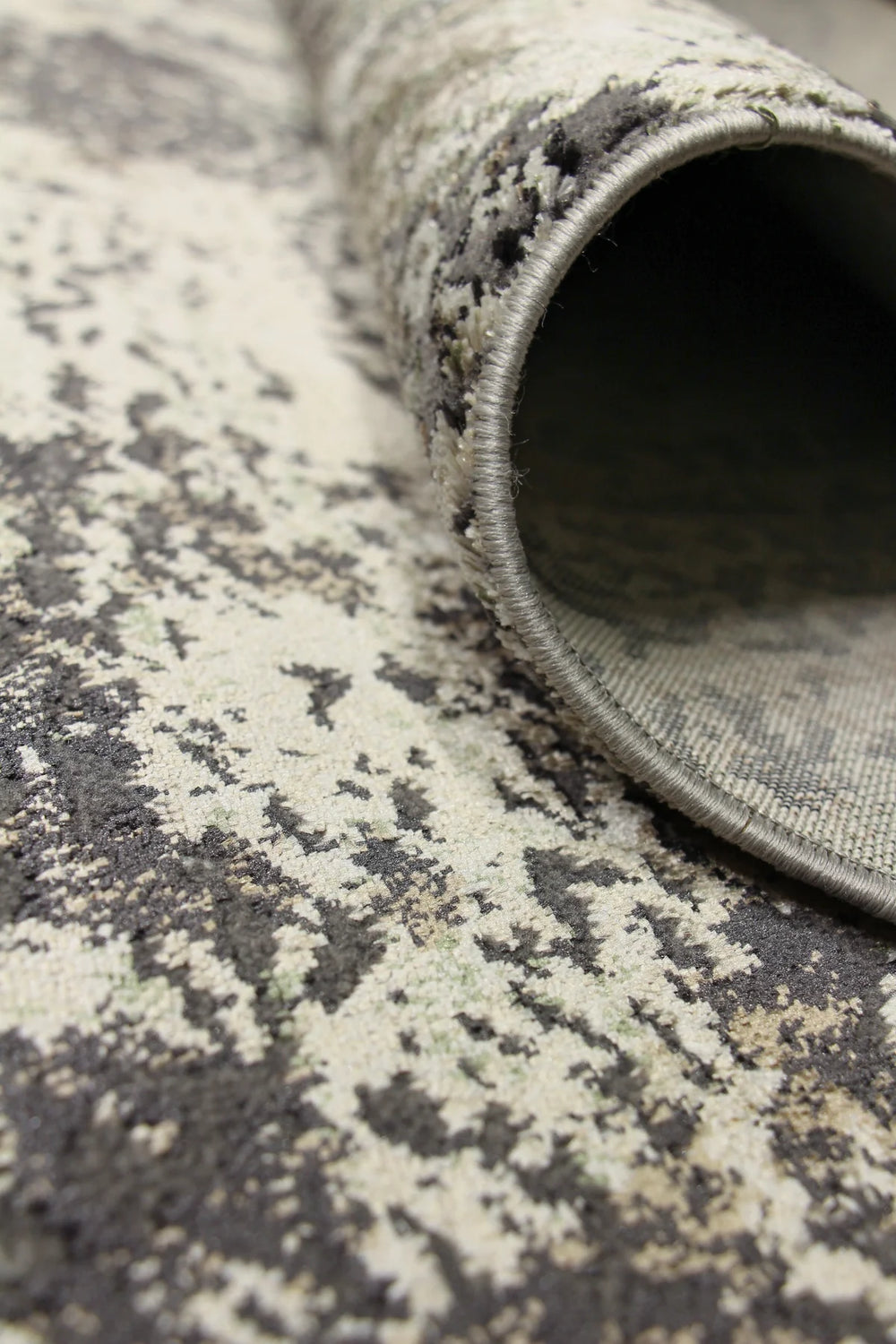 The Belfast 93 rug makes a bold artistic statement with its unique, abstract design. Its surface features a dynamic pattern of large, distressed circular shapes in a deep charcoal and dark grey, which stand out against a soft, mottled background of light grey, subtle brown, and hints of deep green. This compelling visual creates a sense of fluid movement and rich texture, providing a powerful focal point for any room.