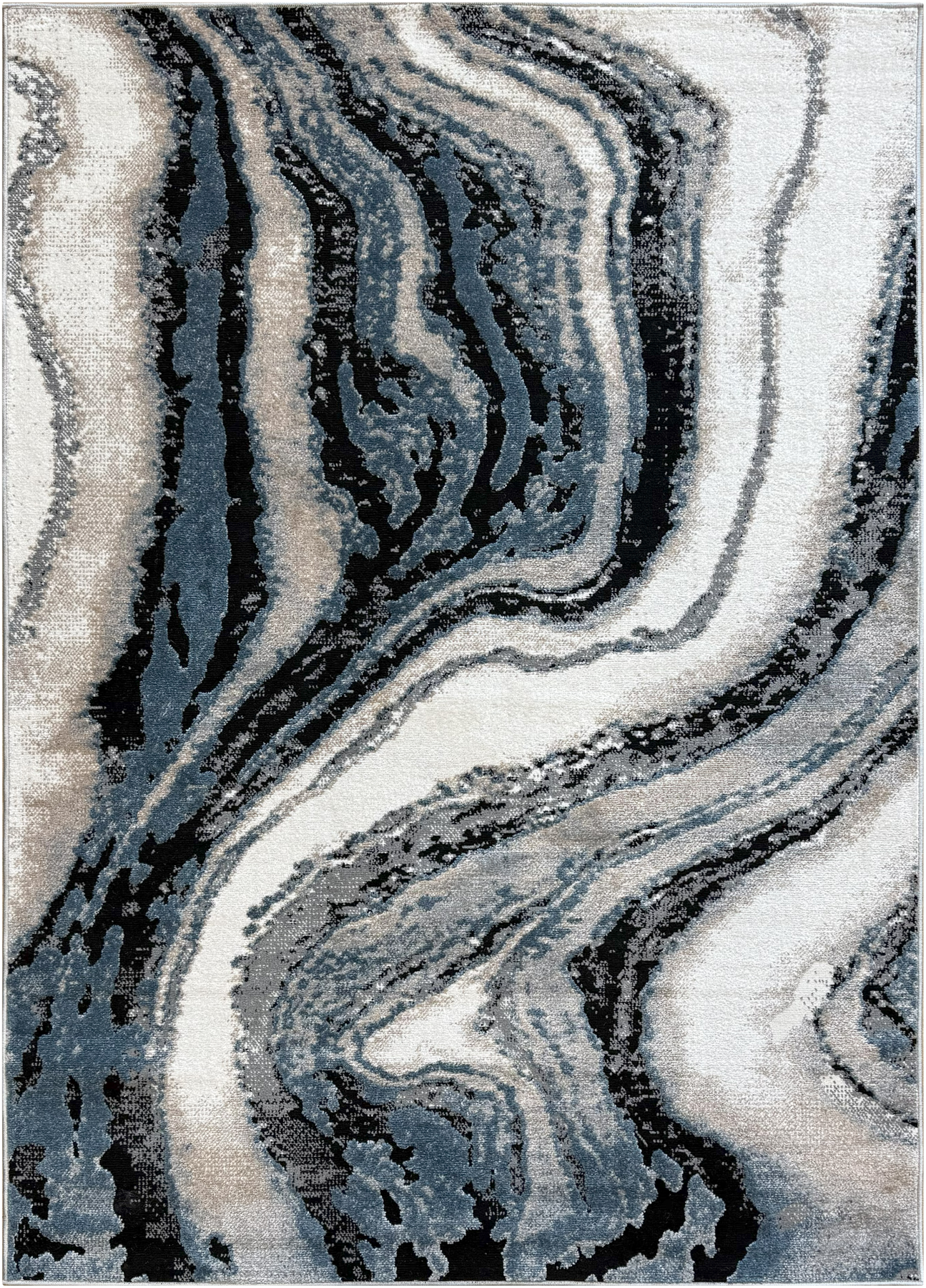 Monty 239 Beige/L.Grey captures the fluid beauty of natural stone with a dramatic marbled pattern. Swirling layers of beige, light grey, black, and slate blue flow across the surface, creating a bold yet calming effect. The contrast between light and dark tones adds depth and movement, while the soft palette keeps the look grounded and versatile.